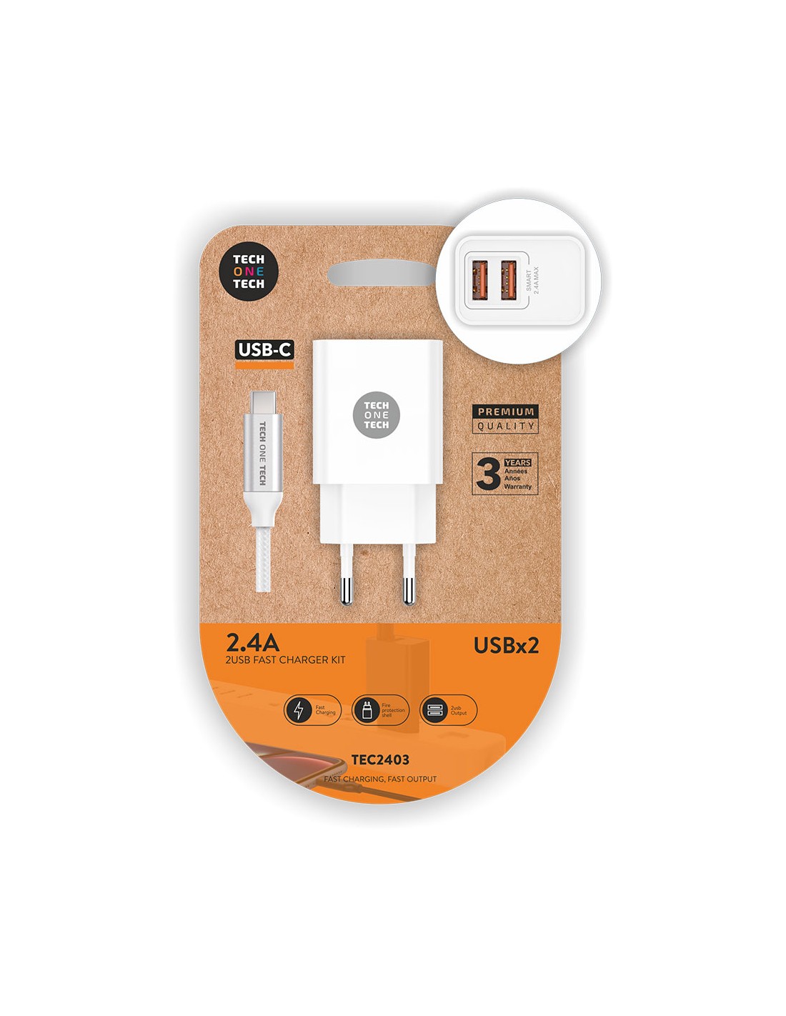 Cargador doble blanco+cable nylon usb-c 2,4a 12w 5v tech one tech. kit compuesto por cargador rápido doble con entrada de 100-240v, dos salidas usb de 2,4 a. color blanco, medidas 37mm x24mm x 77 mm, peso 40 gramos y cable de datos y carga rápida de 1 m. de longitud, con conector tipo usb-c, cable recubierto de nylon trenzado y conectores metálicos para una mayor resistencia y durabilidad. salida 2x inteligente: 2 puertos de salida que se adaptan automáticamente a la corriente requerida para la carga, 2,4a cuando cargamos un solo dispositivo y 1a cuando cargamos 2 dispositivos simultáneamente. smart recognition: incorpora microchip de gestión de energía, identificación inteligente (ic), carga de manera eficiente y protege completamente su equipo.