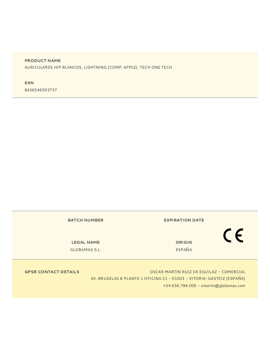 Auriculares eartech hip ergonómicos, para los que no se quieren quedar sin batería. sonido estéreo con micrófono, control de volumen y tercer botón multifunción, música y llamadas. garantía de compatibilidad con dispositivos apple. color blanco, longitud del cable 1,2m, sensibilidad: 102±3db/mw(db), conector: lightning, no necesitas adaptador para conectar a apple, frecuencia: 20 hz - 20khz, impedancia: 32 ohmios +-15%, micrófono: -42db +-3db, materiales: abs y elastómero termoplástico. atención: es necesario activar "bluetooth" en el móvil antes de conectar los auriculares. tech one tech