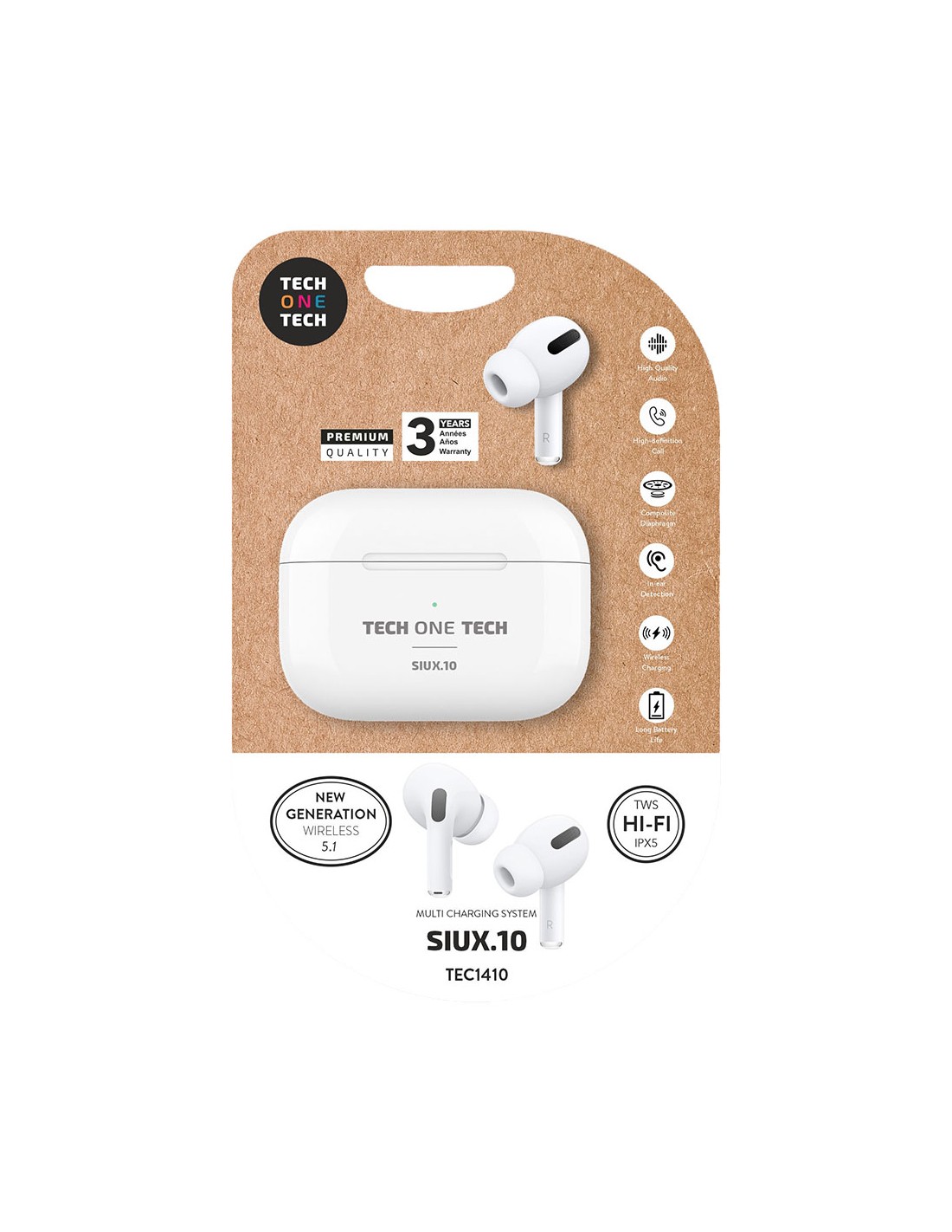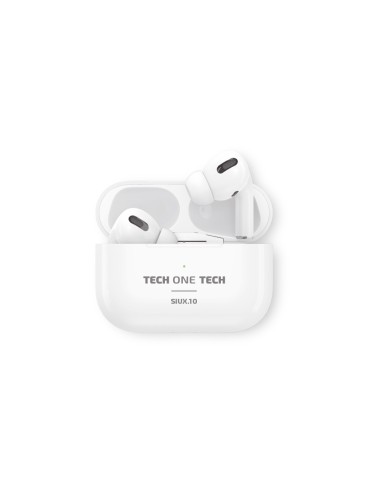 Auriculares inalámbricos siux.10. acabado soft touch, asistente por voz y estuche de carga inalámbrica qi. dotados de sensores de movimiento que detectan cuando los llevas puestos. válidos para cualquier teléfono o dispositivo con bluetooth. diseñados para usar bajo la lluvia ipx5. bluetooth tws 5.1 con 10m de alcance, mejora de sonido mediante diafragma compuesto."bip" de sincronización fácil. hasta 30h de reproducción con el estuche de carga incluido, tiempo de carga: 1,5h, tiempo de reproducción: superior a 5h.capacidad de la batería de los auriculares: 30 mah y capacidad del estuche de carga: 300 mah, carga inalámbrica del estuche. incluye cable de carga apple/lightning de 25cm, manual de usuario, auriculares y estuche de carga. tech one tech