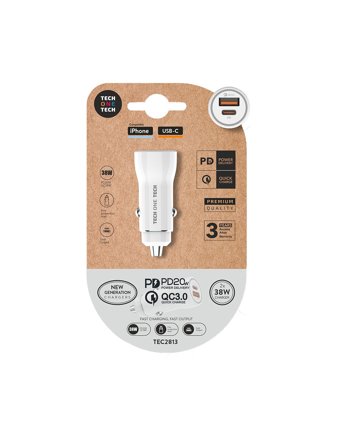 Cargador para automóvil combina alta velocidad y eficiencia gracias a sus dos puertos de carga, permitiéndote cargar dos dispositivos simultáneamente. esta dotado de las tecnologías: usb-c pd de 20w: power delivery 5v-3a / 9v-2.22a, usb-a qc de 18w: quick charge 3.0 5v-3a / 9v-2a / 12v-1.5a. entrada: dc 12-24v y salida máxima: 38w. adecuado para todos los usos y dispositivos exigentes. compatibilidad con dispositivos que utilizan entrada usb, como smartphones, tablets y reproductores mp3. garantía: 3 años. tech one tech