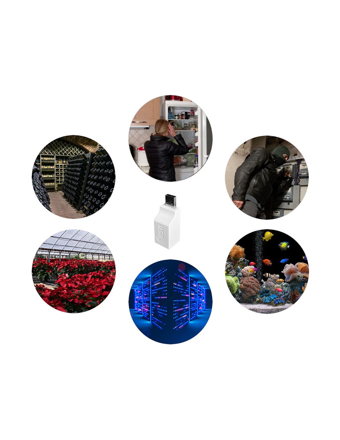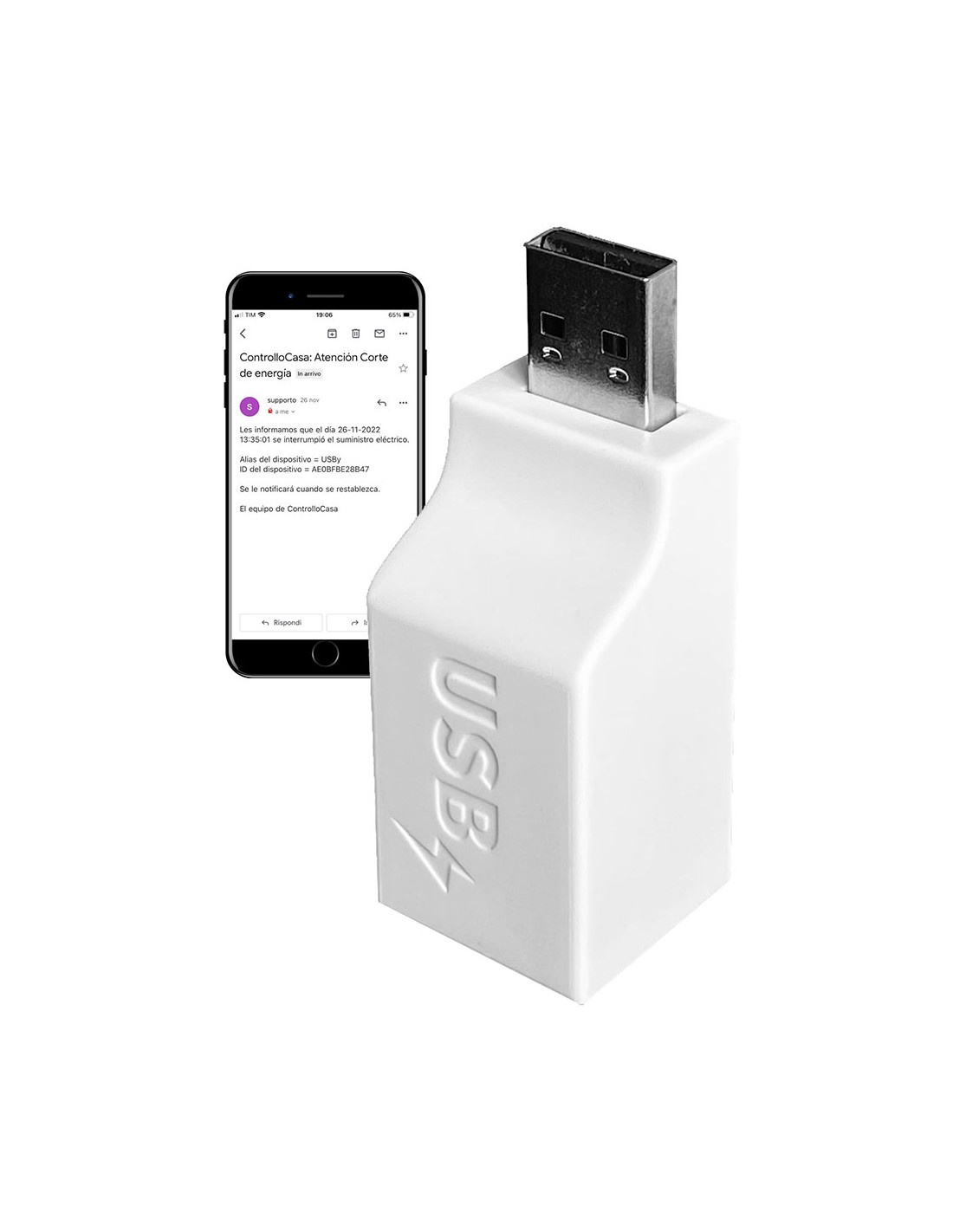 Usby es un dispositivo usb que te avisa cuando falla el suministro eléctrico y internet, cuando se restablece informa del tiempo total del apagon mediante un mail directamente a tu telefono de forma gratuita. tambien avisa si la temperatura ambiente baja o sube de los limites configurados por el usuario. esencial para monitorizar temperatura, internet y wi-fi de: sistemas refrigeradores o congeladores, segundas residencias, acuarios, centros de datos, bombas hidraulicas, sistemas de riego, dispositivos medicos, sotanos, invernaderos, no necesita dispositivos gsm, tarjeta sim o ups. no necesita estar enchufado a dispositivos, puede usarse con cualquier bloque de cargador usb.ideal para evitar que personas malintencionadas intenten alterar su sistema de alarma con cortes de energia.disponibles cinco servicios adicionales. wi-fi: 802.11b, g, n modo sta 802.11b, g modo punto acceso 2,4 ghz, 5v funcionamiento entre -20 y 80°c. 56 x 23 x 22 mm