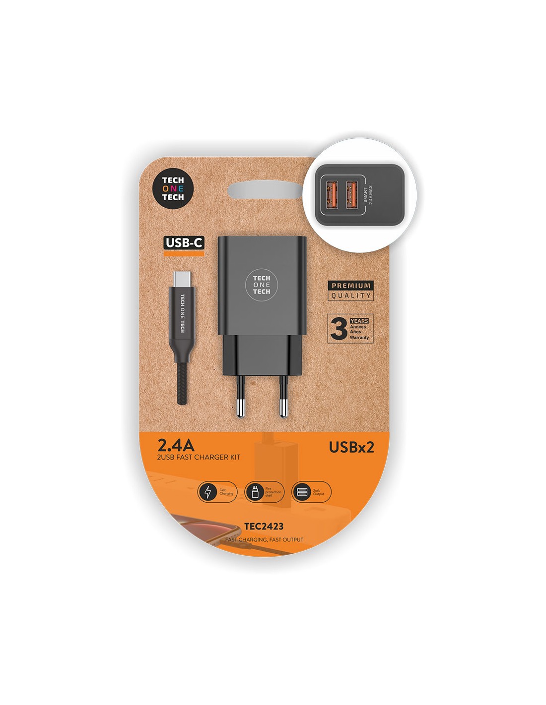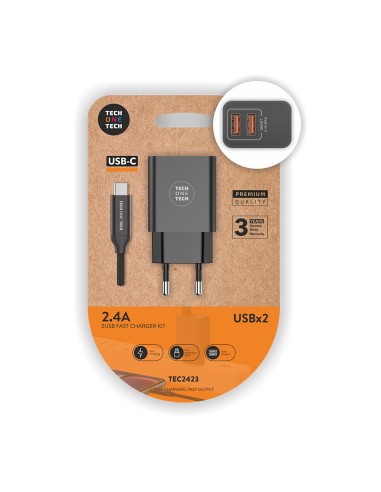 Kit compuesto por cargador rápido doble, dos salidas usb de 2,4 a. color negro, medidas 37 x 24 x 77 mm, peso 40 gramos y cable de datos y carga rápida de 1 m. de longitud, con conector tipo usb-c, cable recubierto de nylon trenzado y conectores metálicos para una mayor resistencia y durabilidad. 2 salidas usb con identificación inteligente (ic), carga de manera eficiente y protege completamente su equipo.