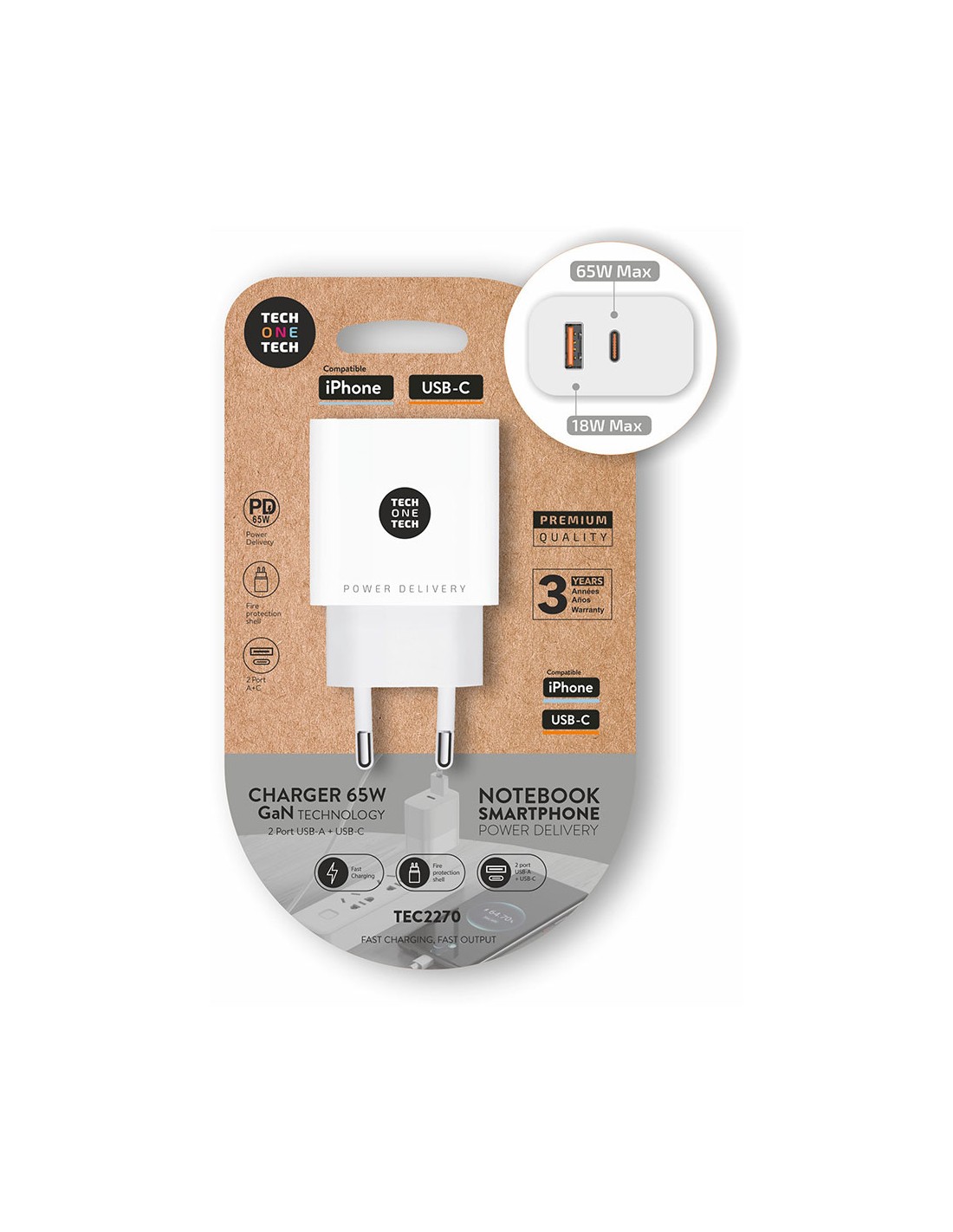 Cargador ultrarápido 65 w con 2 puertos: usb-c y usb-a para cargar cualquier dispositivo. la salida usb-c funciona hasta 65 w y la usb-a hasta 18 w. compatible con dispositivos anteriores. este cargador permite cargar dispositivos como tabletas, móviles, consolas, baterías, auriculares, etc.