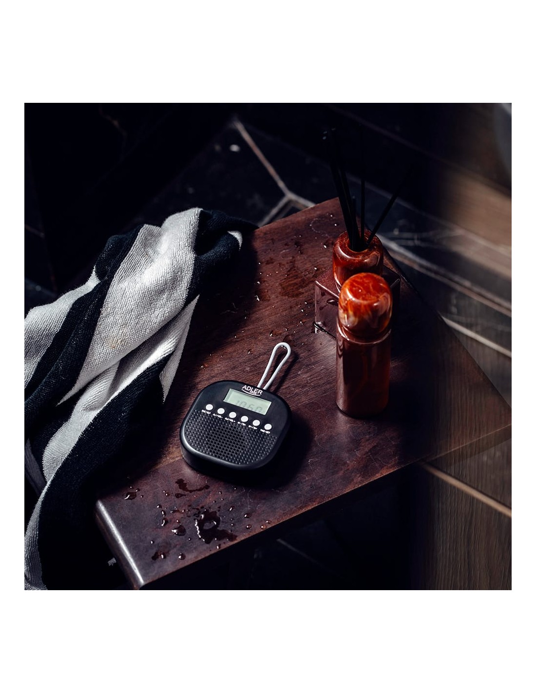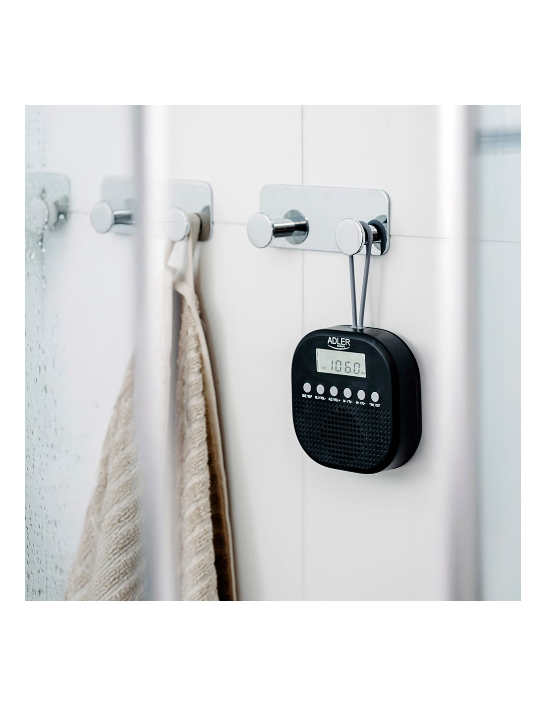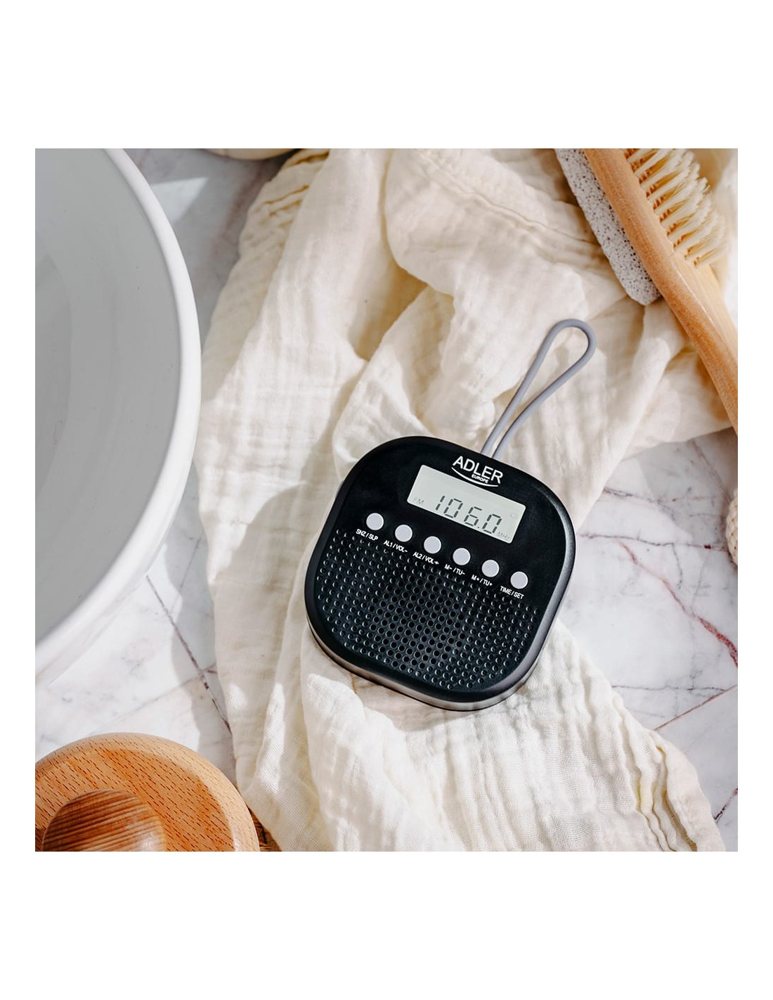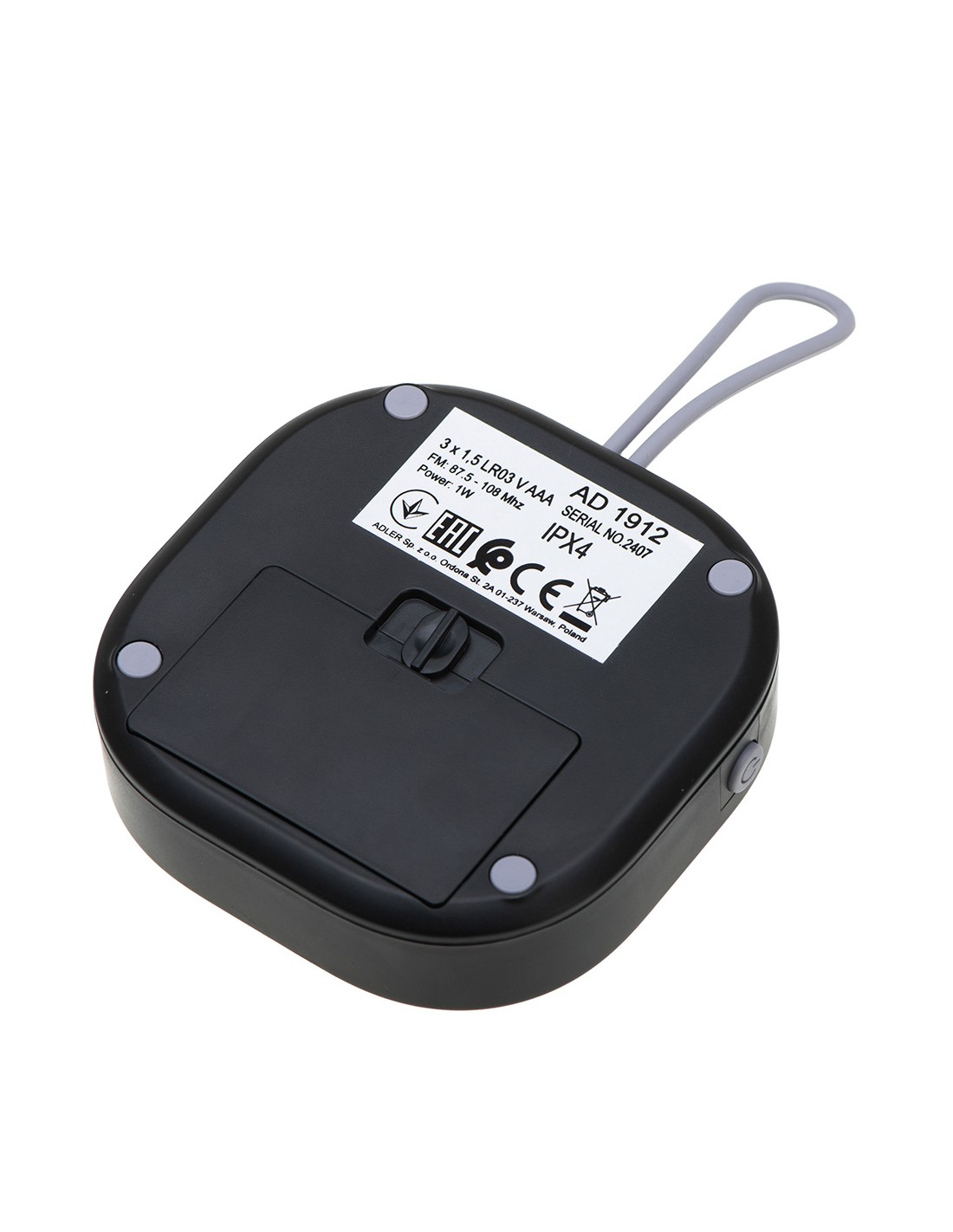 Radio fm resistente al agua ipx4 cuélgalo en la ducha o escucha música bajo la lluvia rango: fm 87.5-108 mhz función de reloj 2 alarmas independientes función repetición de 10 a 90 minutos funciona con 3 pilas aaa (no incluidas) colgador de silicona flexible 9 x 9 x 2,5 cm