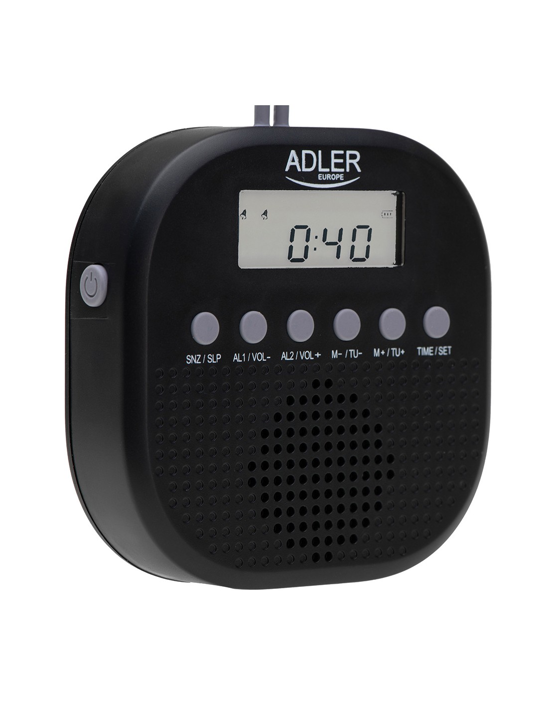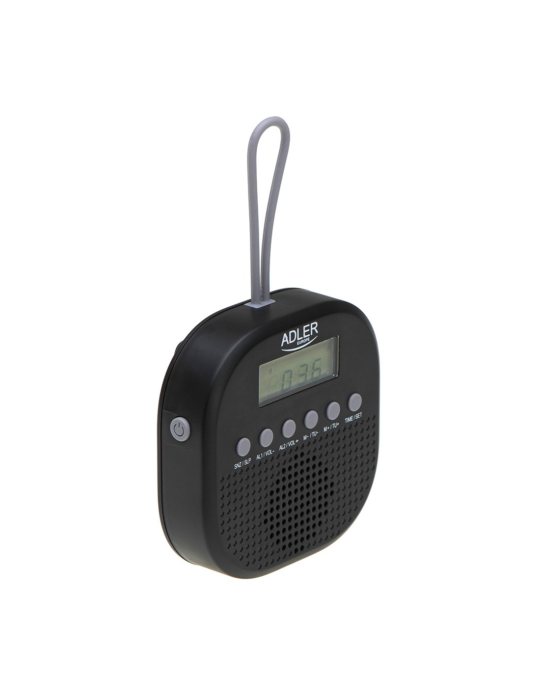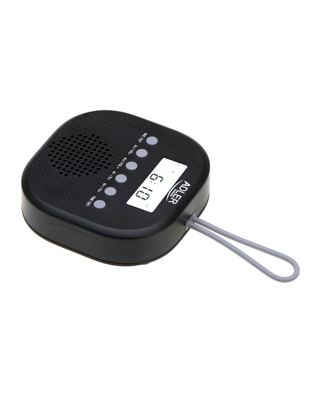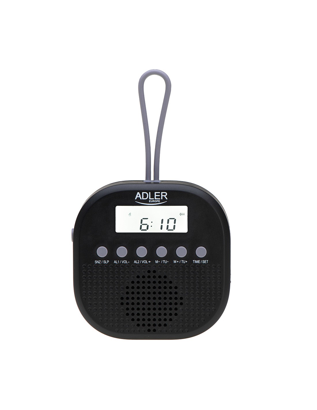 Radio fm resistente al agua ipx4 cuélgalo en la ducha o escucha música bajo la lluvia rango: fm 87.5-108 mhz función de reloj 2 alarmas independientes función repetición de 10 a 90 minutos funciona con 3 pilas aaa (no incluidas) colgador de silicona flexible 9 x 9 x 2,5 cm