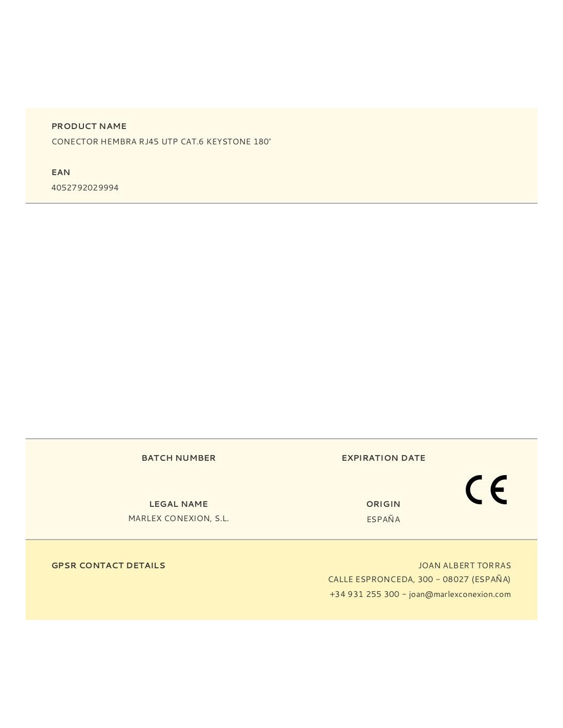 Conector hembra rj45 utp cat.6 keystone 180°, awg 22-26. montaje sin herramienta