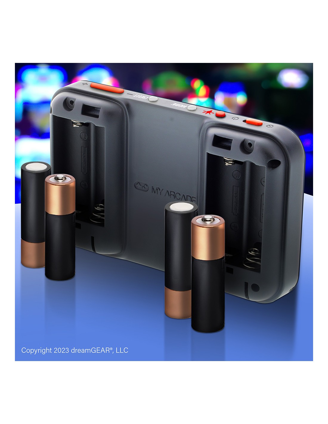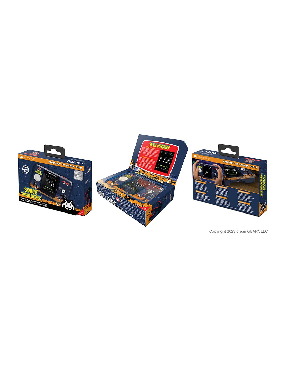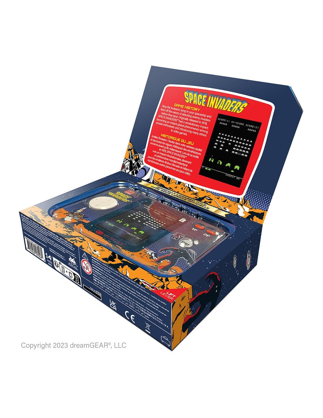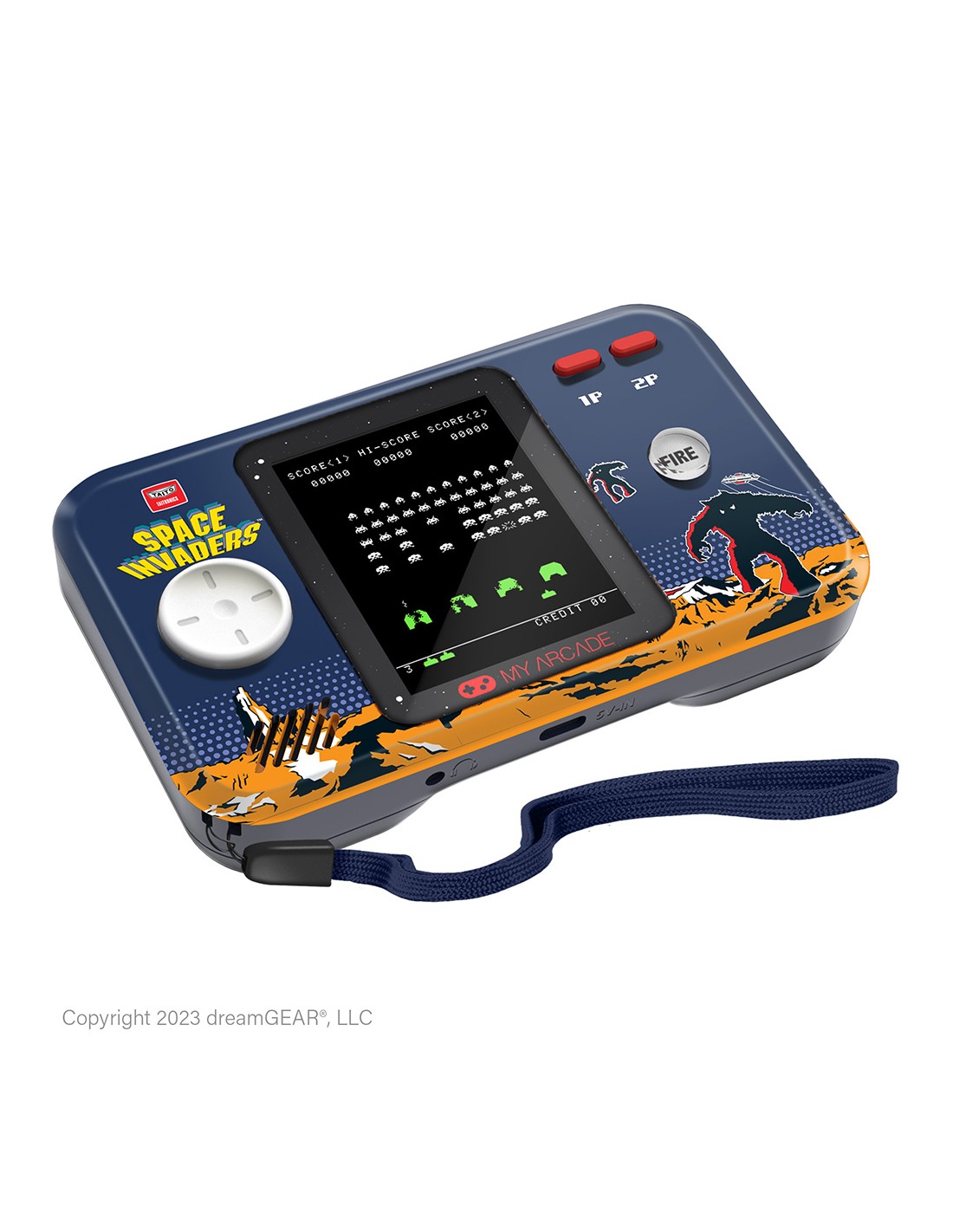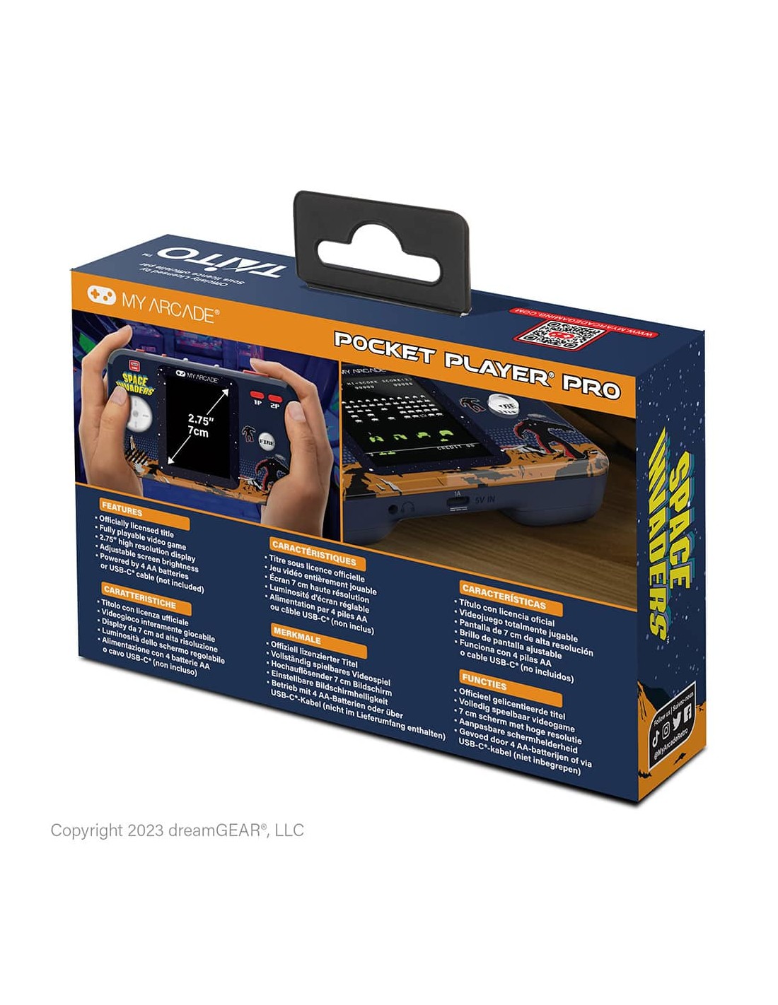 Pocket player pro space invaders portable gaming system título con licencia oficial pantalla 2,75" de alta resolución a todo color. altavoz incorporado con control de volumen. puerto de auriculares de 3,5 mm. brillo de pantalla ajustable. alimentado por 4 pilas aa (no incluidas) o un cable usb-c (no incluido). diseño ergonómico. incluye guía de usuario y lanyard