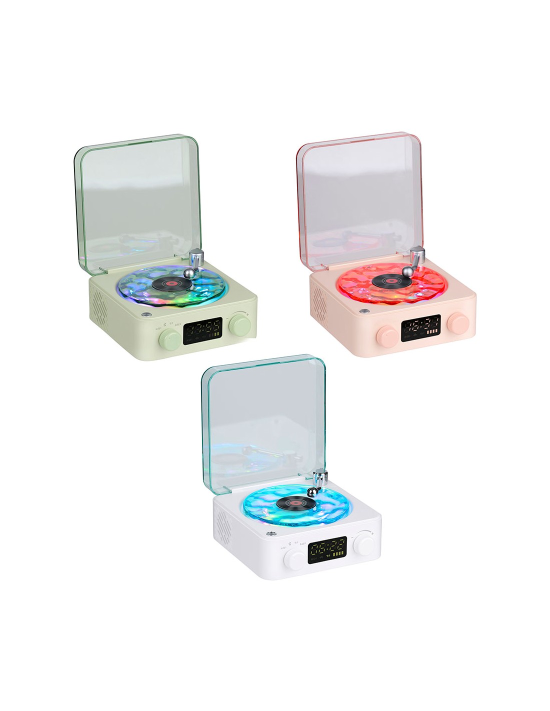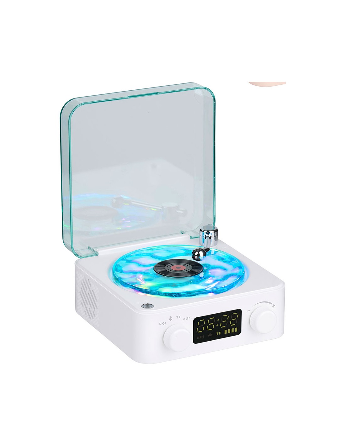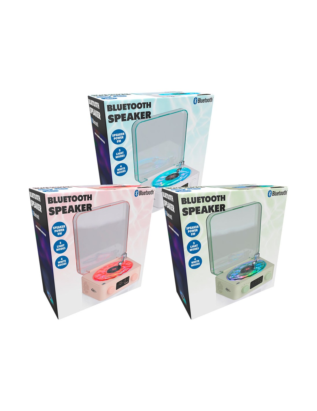 Altavoz bluetooth en forma de tocadiscos 5 w con 10 leds rgb, 3 modos de luz, 5 modos de ruido blanco de 6 h de duración, reloj, tiempo de carga 3 h, cable usb-c incluido, entrada audio aux y tarjeta tf, dimensiones 14 x 15 x 7 cm