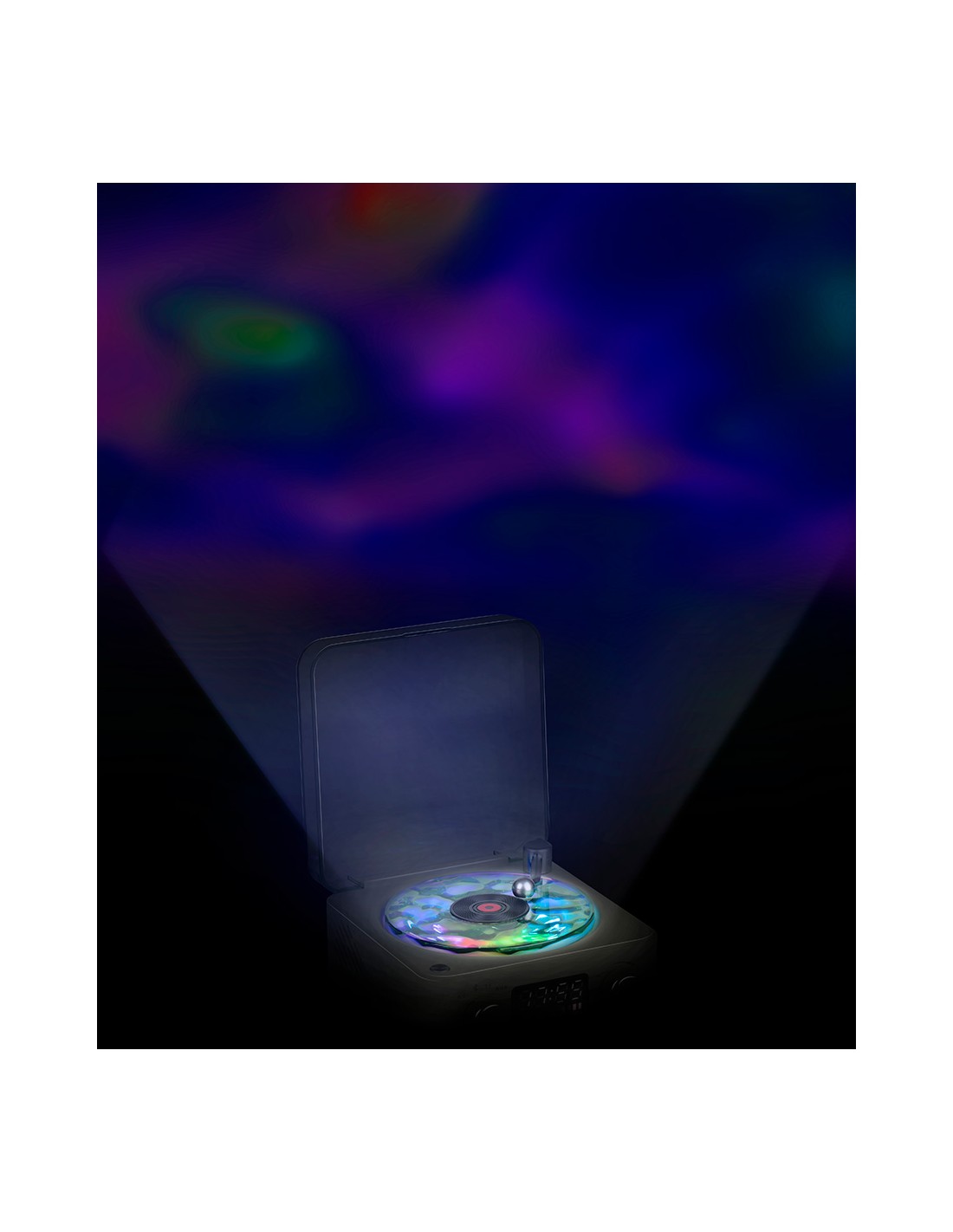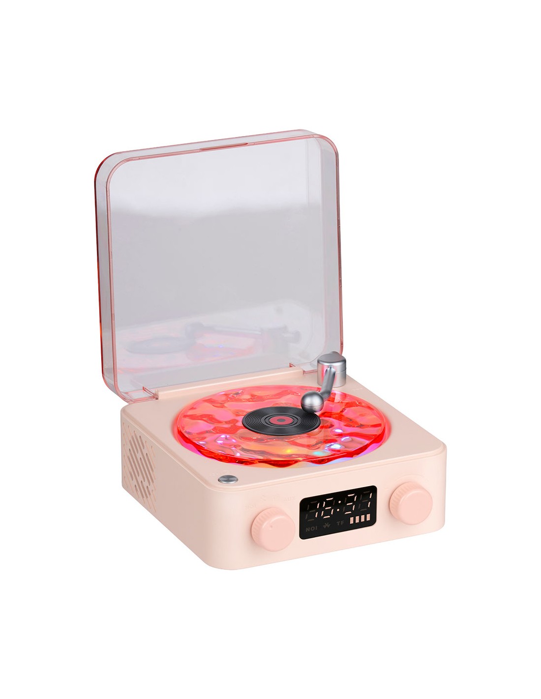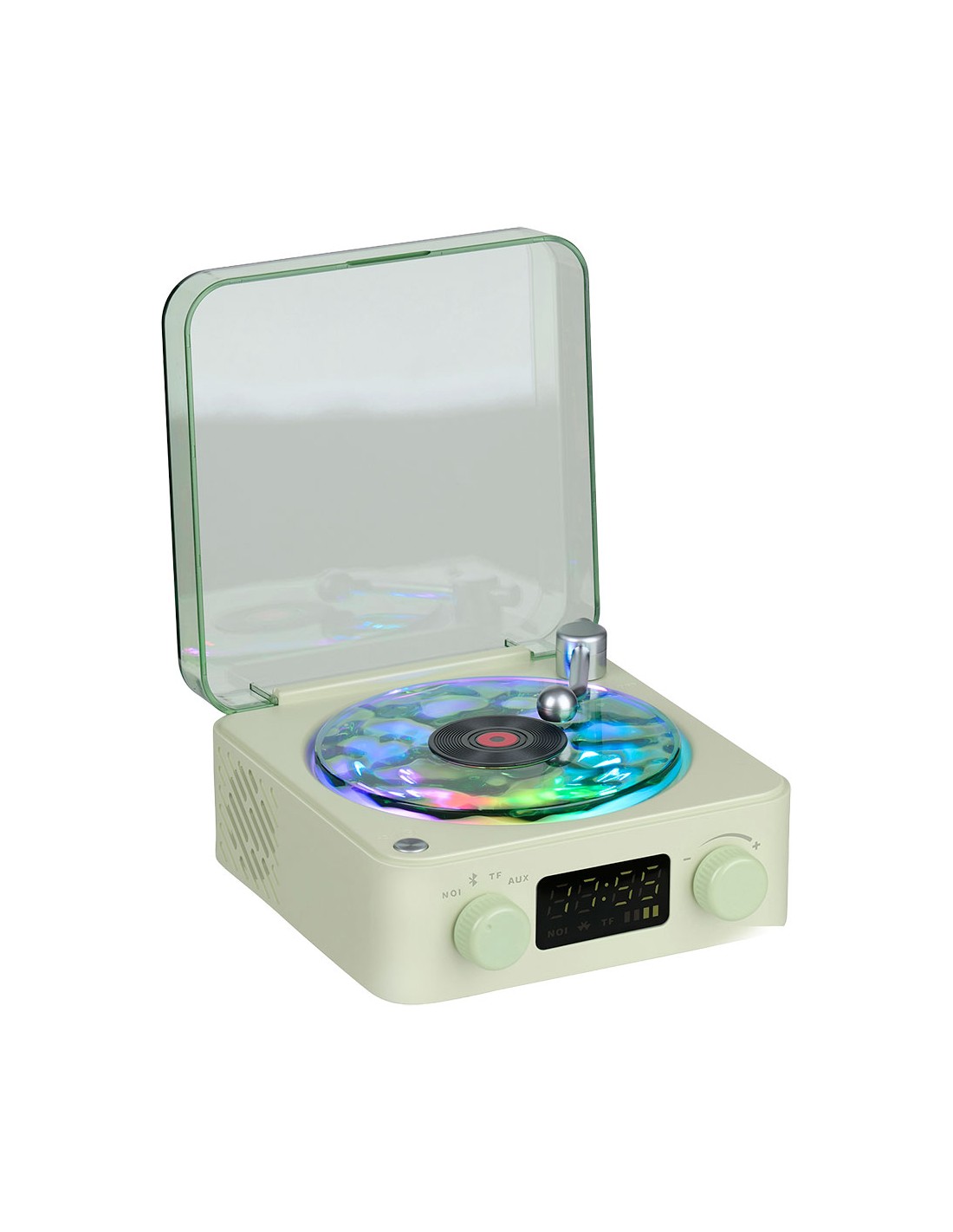 Altavoz bluetooth en forma de tocadiscos 5 w con 10 leds rgb, 3 modos de luz, 5 modos de ruido blanco de 6 h de duración, reloj, tiempo de carga 3 h, cable usb-c incluido, entrada audio aux y tarjeta tf, dimensiones 14 x 15 x 7 cm