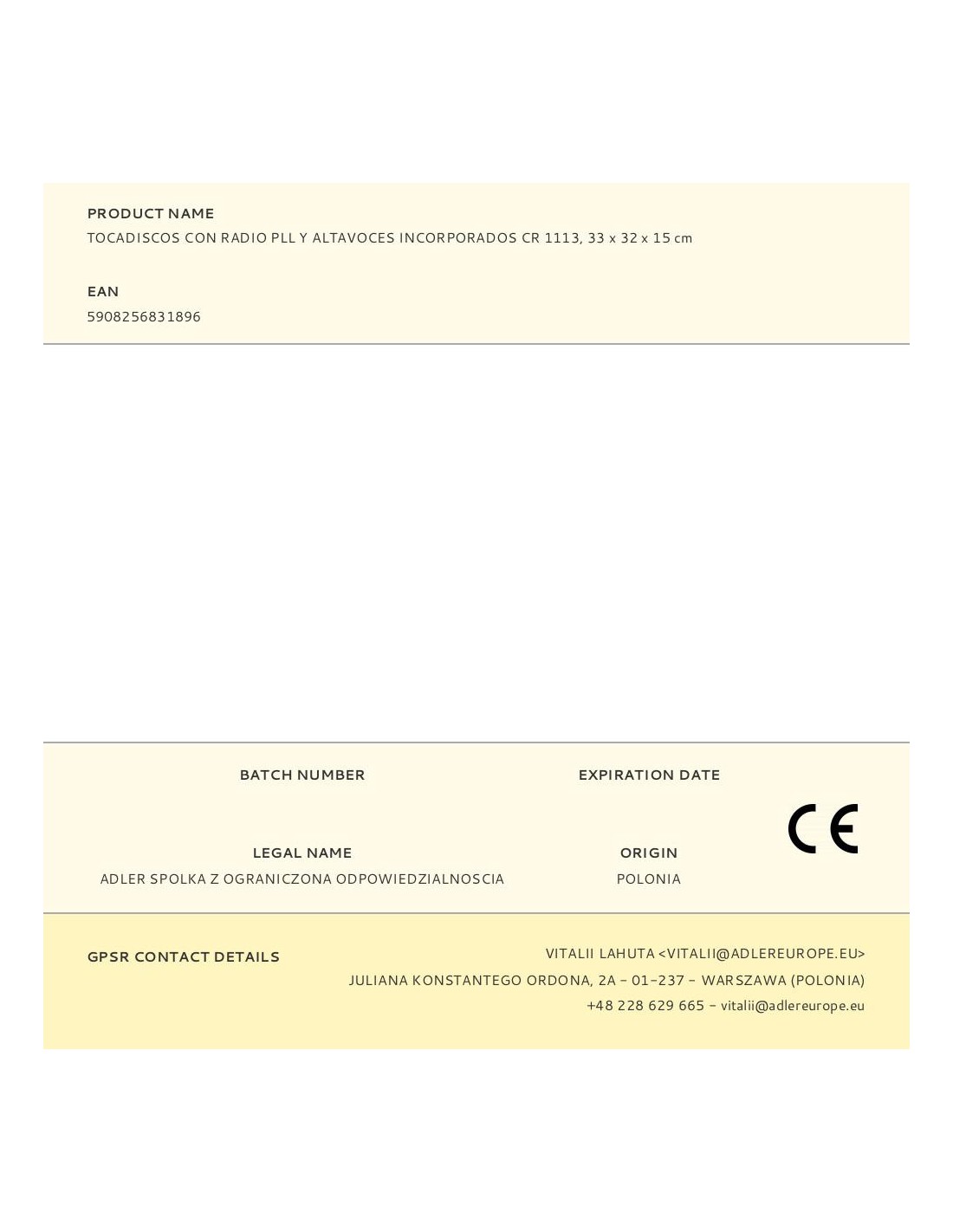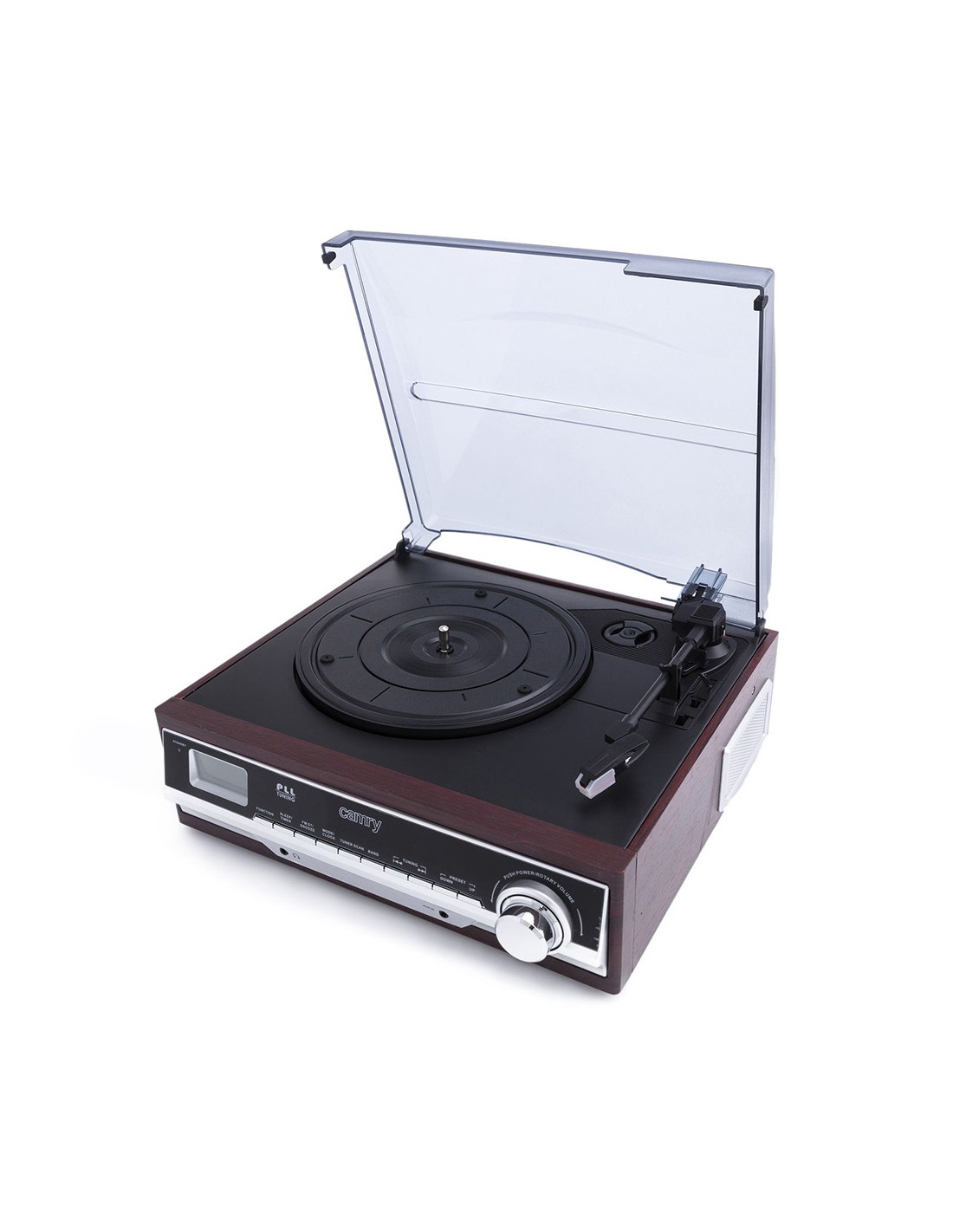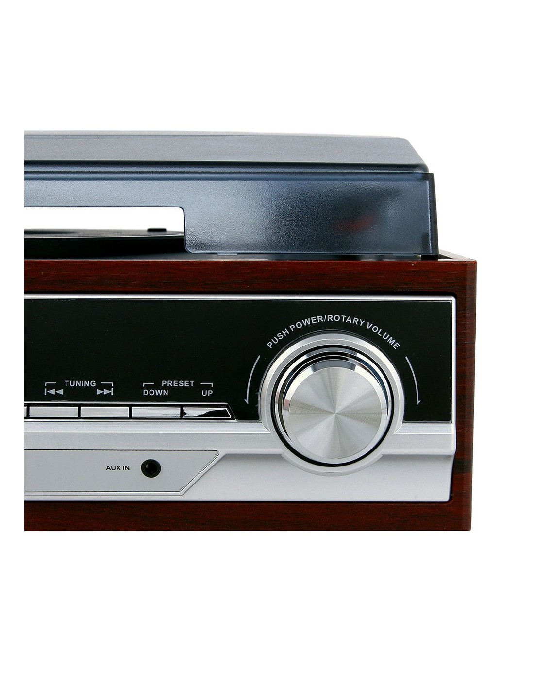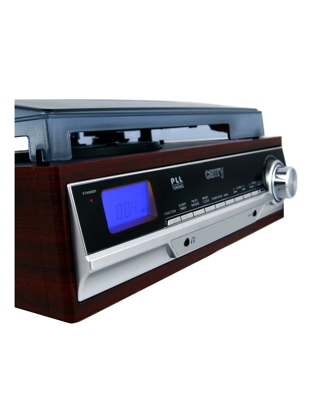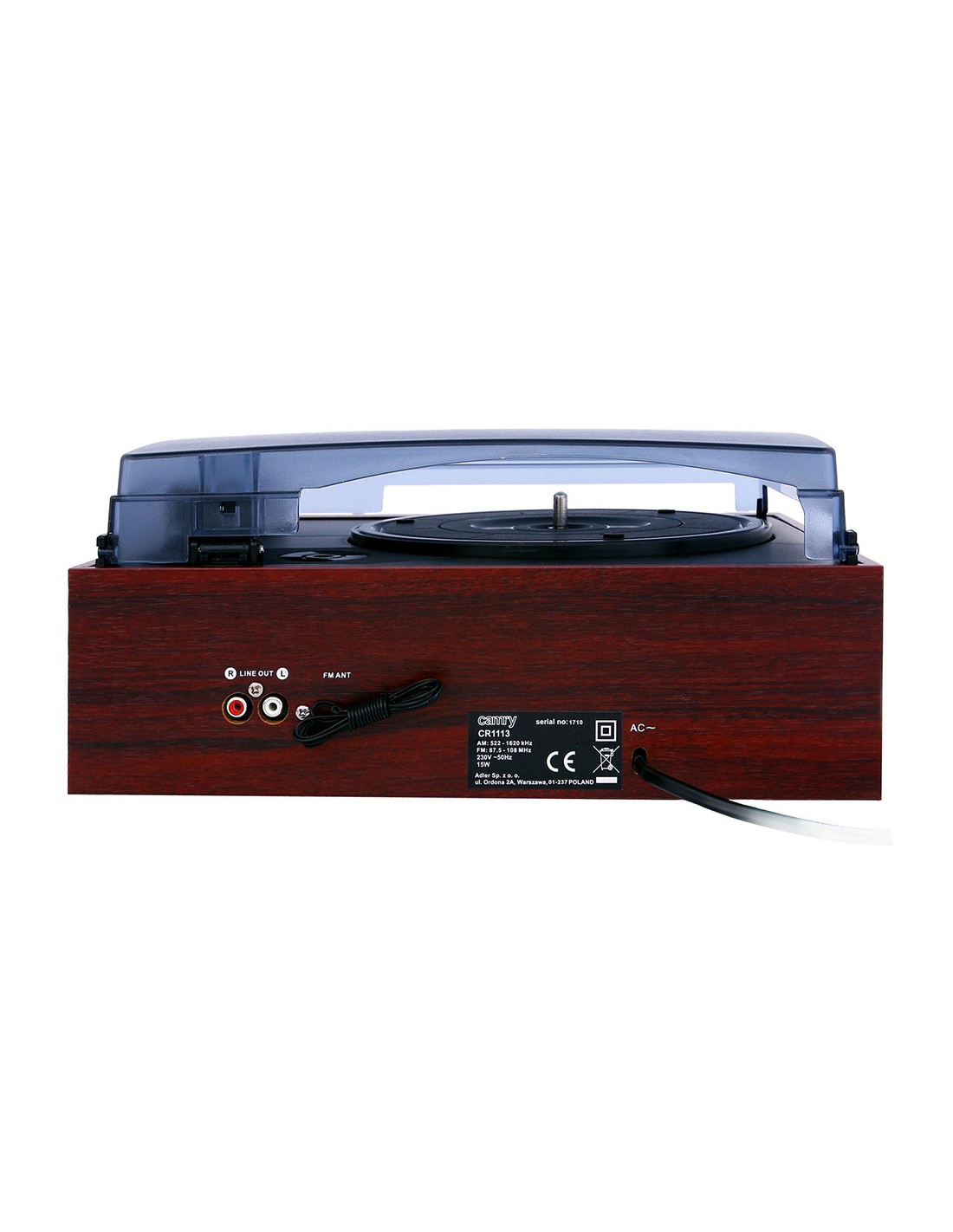Tocadiscos con radio cr 1113, color madera 33/45/7 rpm am/fm con sintonizador pll reloj despertador, pantalla lcd, 2 altavoces 1,5 w rms integrados 8 ohm ±15%, thd 10%, sensibilidad 82,7 db ± 3 db conector 3,5 mm, entrada salida auxiliar de potencia 15 w, 100-240 v~50 hz 33 x 32 x 15 cm