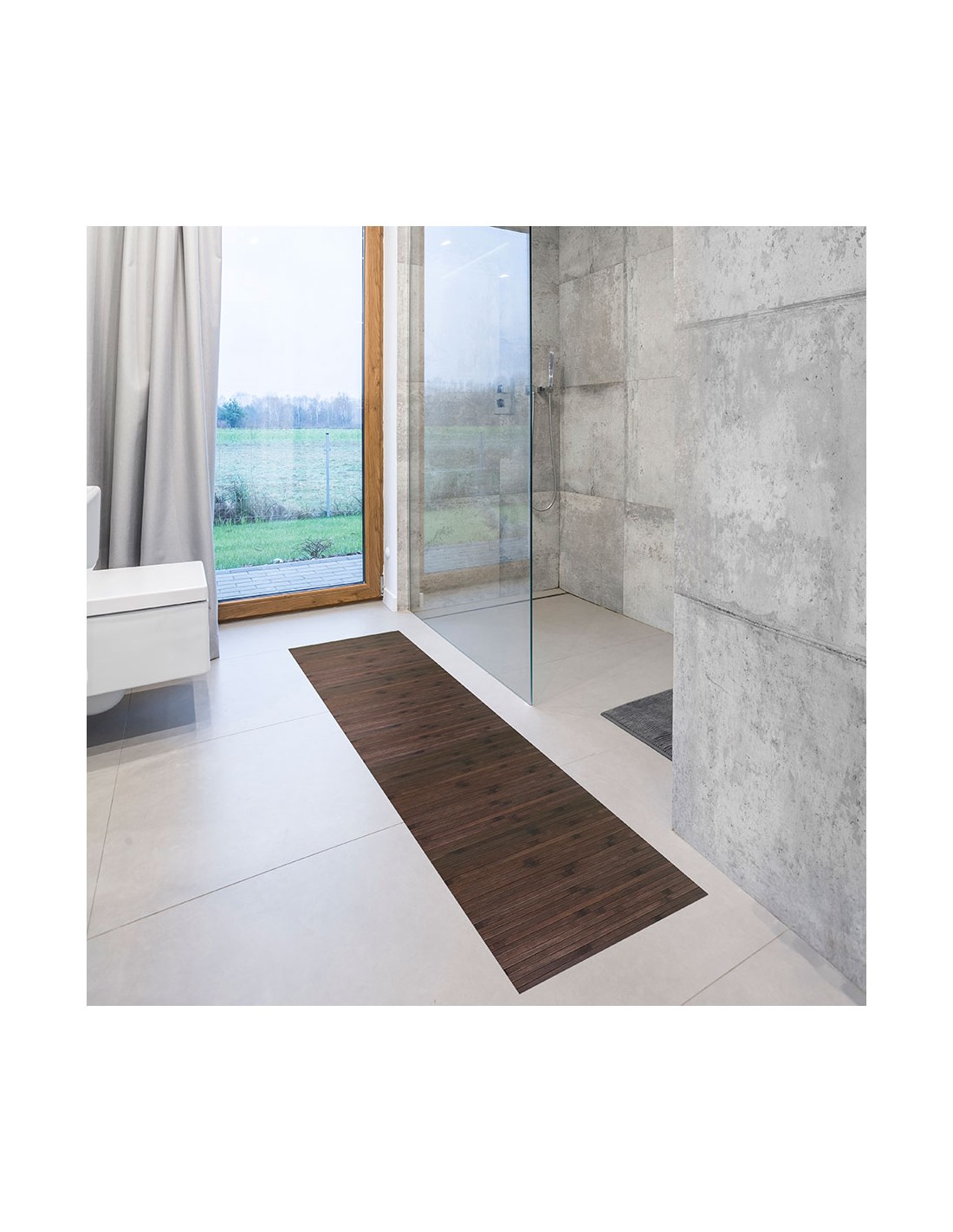 Alfombra bambú wengé 160x240cm. barnizado mate y acabado sin ribete, con corte pulido, efecto tarima. dorso antideslizante.