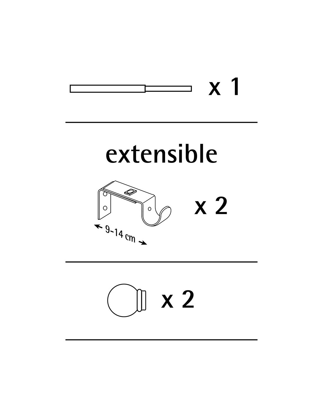 Kit barra cortina anillo extensible de 110 a 200cm negro cintacor - storplanet. barras completas en formato de kit. contienen los componentes necesarios para la instalación : dos barras, 2 soportes extensibles con tacos y tornillos y 2 terminales (sin anillas). acabado satinado. instalación en pared. mantenimiento: limpieza con un paño seco.