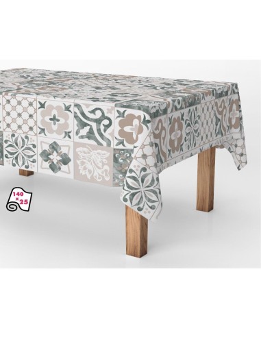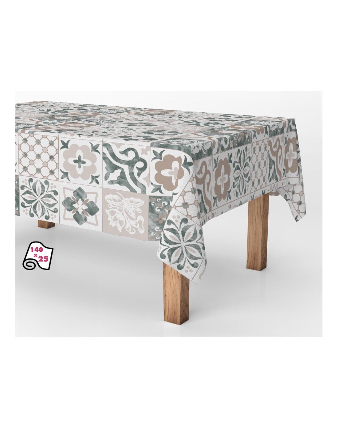 Rollo de hule antimanchas azul-gris 140 cm x 25 m. mantelería de tejido antimanchas gama básica, ancho de 140cm, 25m por rollo, cerámica azul retro. composición 70% poliester, 30% algodón. no lavable, limpieza con paño húmedo en superficie.