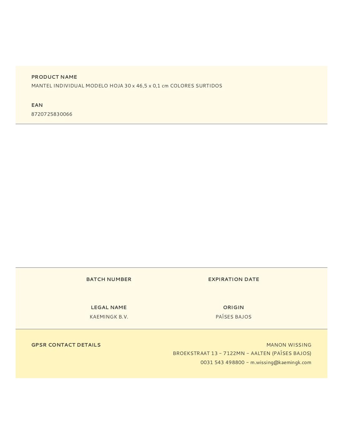 Mantel individual modelo hoja 30x46,5x0,1cm colores surtidos 806642 material reciclado, ideal para decoración de interiores.