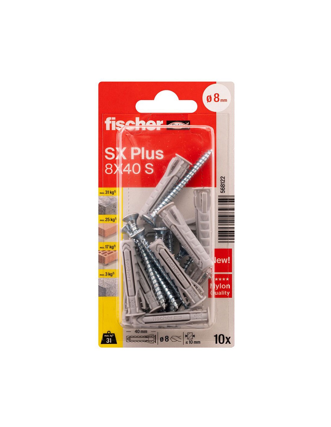 Tacos sx plus sk nv ø8 x 40 mm + tornillos ø5 x 55 mm, pz2. blister 10 uds. fijación de nylon con cuatro tipos de expansión, con reborde y tornillo para una sujección óptima. aplicaciones: iluminación, armarios, detectores de movimiento, rodapiés, estanterías ligeras, armario con espejo, buzones, muebles de televisión, enrejados, postigos plegables, instalaciones de baños y servicios