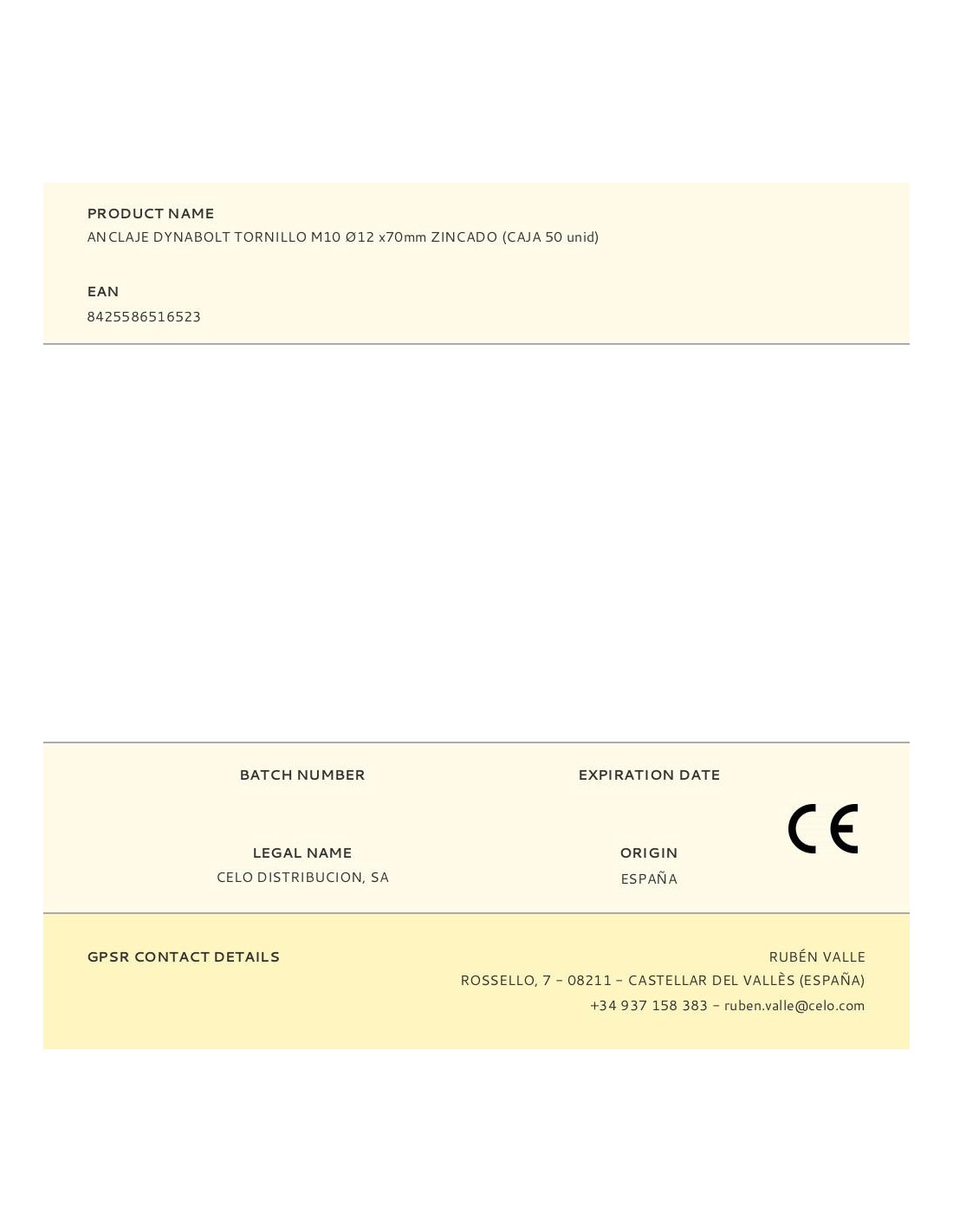 Caja 50 unidades anclaje dynabolt tornillo m10 ø12x70mm zincado