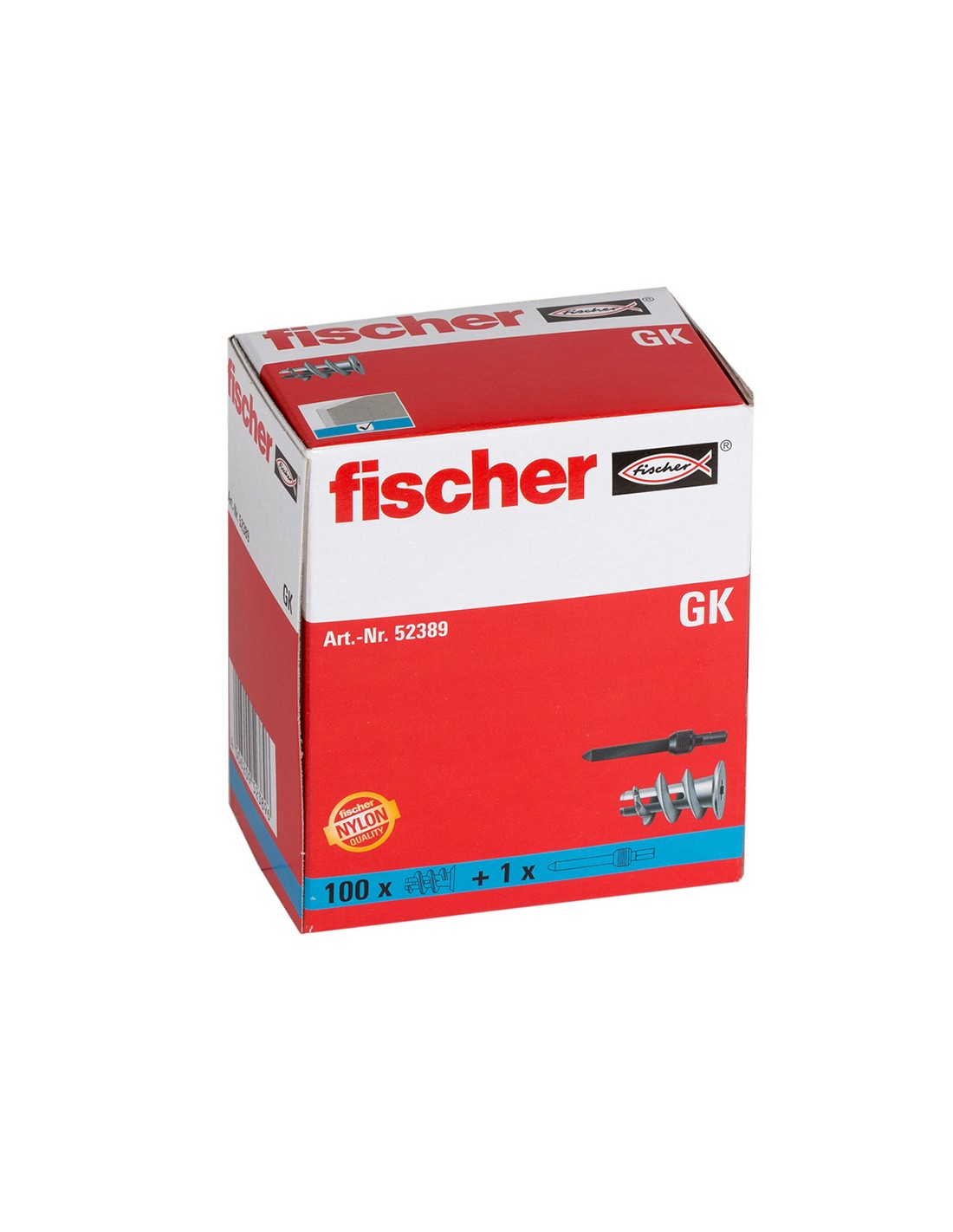 Pack 100 fijacion nylon de paneles de yeso 52389-gkm. fischer instalacion simple y rapida gracias a la herramienta de montaje. gran capacidad de carga gracias a la fijacion de ajuste positivo. se requiere menos espacio detras del tablero debido a la corta longitud del anclaje. perfecto para instalacion en serie. gracias a la ranura en cruz en la cabeza del taco, el gk se puede desmontar tambien sin herramienta de insercion como un tornillo.