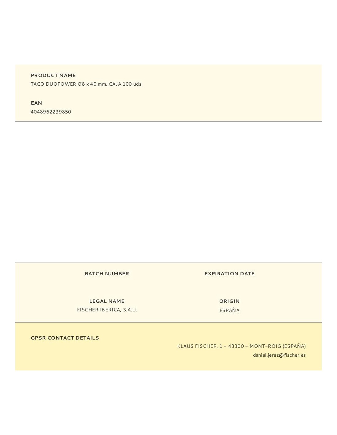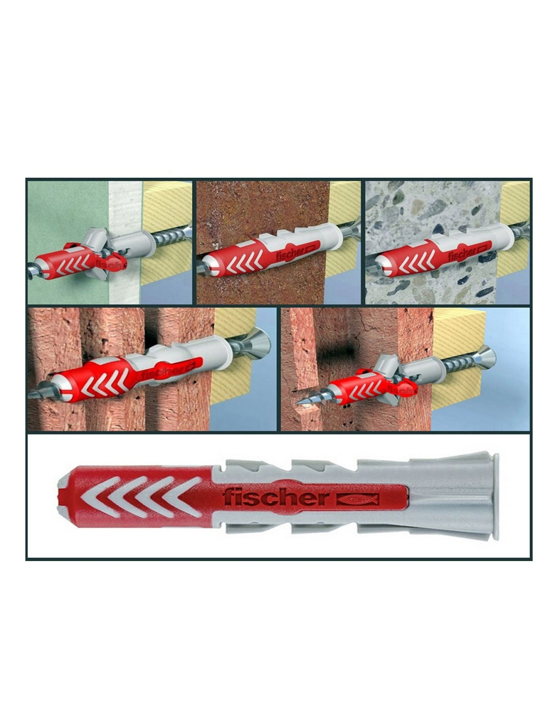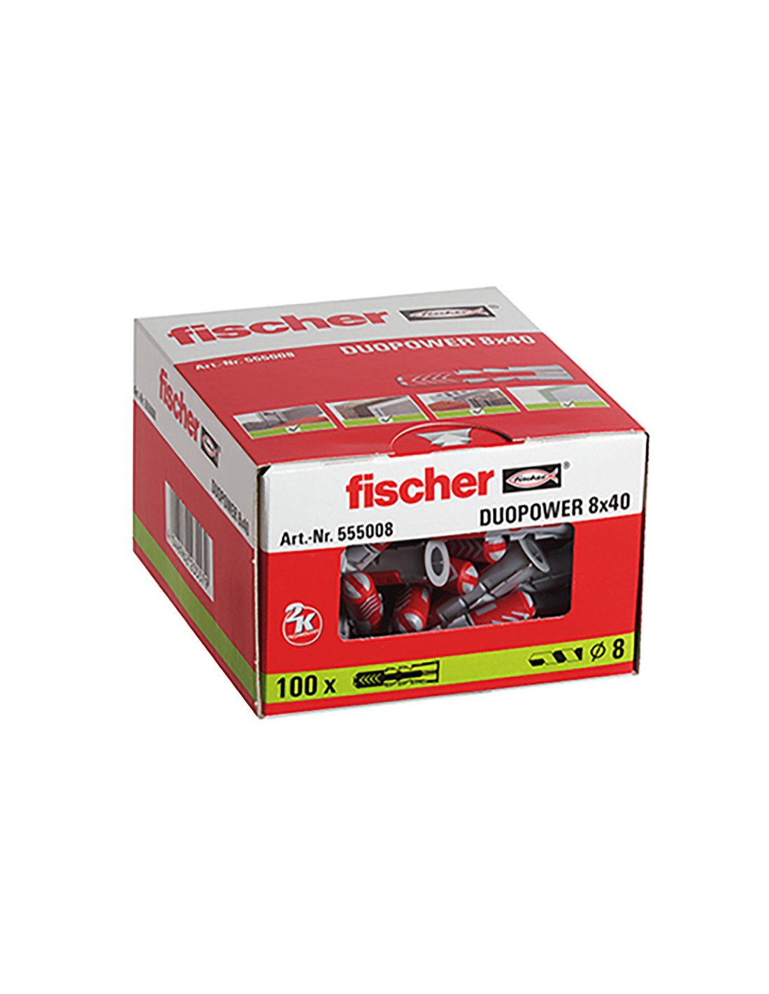 Taco duopower ø8 x 40 mm, caja 100 uds. combinacion de dos componentes de materiales para un mayor rendimiento. funciones seguras para materiales macizos (expansion) y perforados o placas (bloqueo/anulado). montaje sencillo: el borde estrecho del taco impide que se hunda en la perforacion. mejor respuesta posible del taco: se nota que el taco encaja a la perfeccion