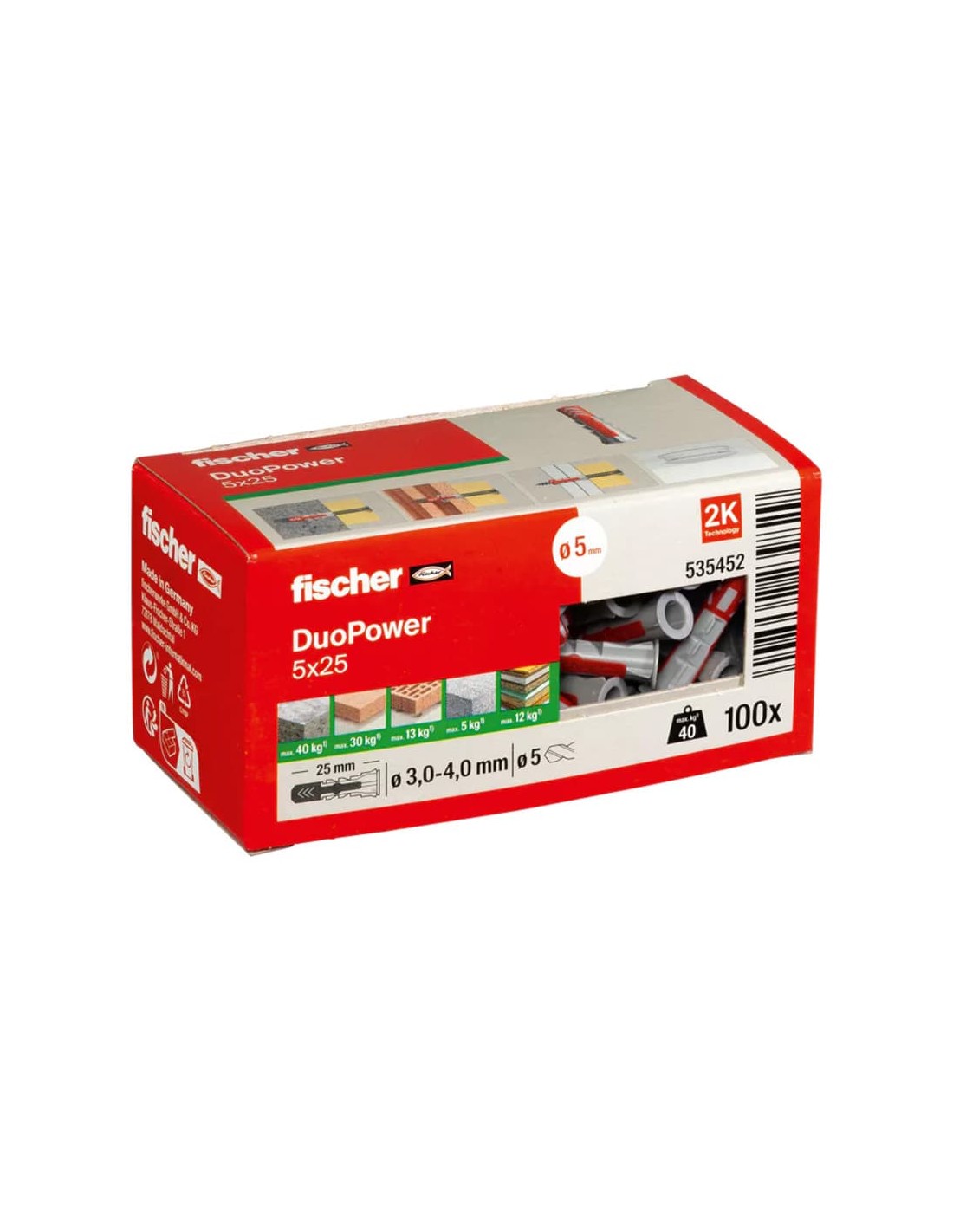 Taco duopower ø5 x 25 mm, caja 100 uds. combinacion de dos componentes de materiales para un mayor rendimiento. funciones seguras para materiales macizos (expansion) y perforados o placas (bloqueo/anulado). montaje sencillo: el borde estrecho del taco impide que se hunda en la perforacion. mejor respuesta posible del taco: se nota que el taco encaja a la perfeccion