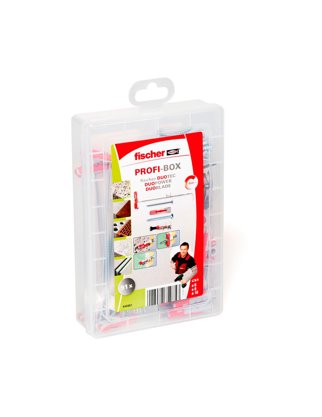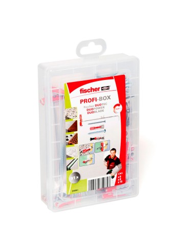 Contiene 30 tacos duopower 6 x 30 mm, 20 tornillos de cabeza avellanda y engarce pozi 4,5 x 40 mm cincados y rosca total, 15 tacos duopower 8 x 40 mm, 8 tornillos de cabeza avellanada y engarce pozi 5 x 55 mm cincados y rosca total, 10 tacos duoblade, 4 tacos duotec 10, 4 tornillos de cabeza redonda y engarce pozi 5 x 60 mm cincados y rosca total. maletín 90 uds