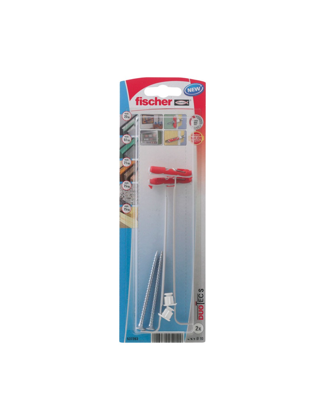 Blister 2 unid, duo tec 10 sk + tornillos fischer. la solución integral para cartón yeso o paredes tipo pladur. máxima carga, multiplaca, paredes y techos. se puede utilizar con rosca madera y rosca métrica y ademas puede utilizarse en materiales macizos. ganando en rapidez en sus instalaciones. se puede utilizar en ambientes húmedos a diferencia de los tacos de vuelco. perfecto para cavidades pequeñas ofreciendo un 25% + de carga que un taco de vuelco.