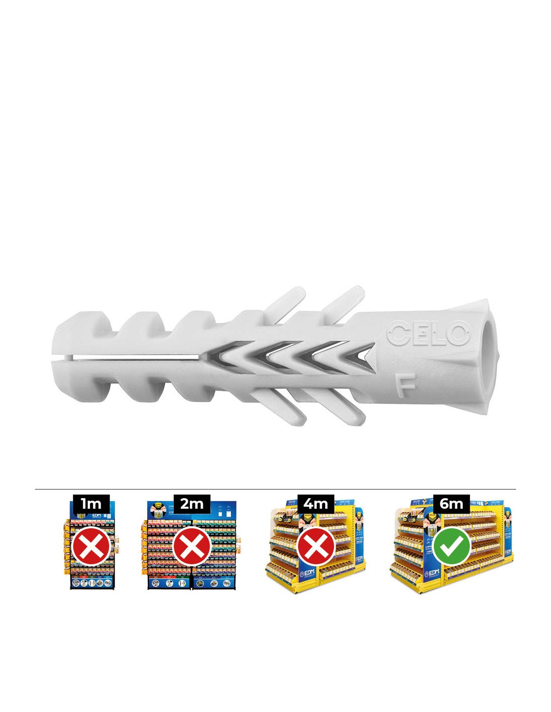 Caja 25 unid. taco nylon doble antigiro din/ref f ø12 x 60 mm . apertura lateral para mayor expansion. 4 aletas anti-giro. interior con guia direccional en el inicio del roscado. adecuado para cargas ligeras y medias