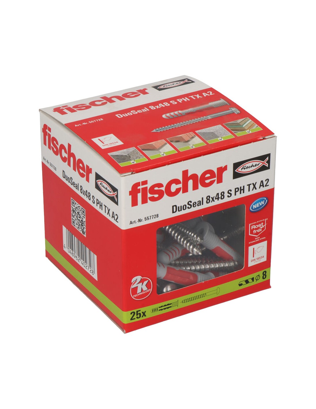 Tacos estanco ø8 x 48 mm + tornillos duoseal ø6 x 70 mm, tx30. sella completamente los agujeros sin necesidad de un compuesto de sellado adicional. ideal para fijar objetos en paredes de baños como estanteria, accesorios, espejo, toalleros, saunas, entornos de piscina, etc. primera fijación de nylon, probada y aprobada según estándares etag 022 y din 18534 garantizando la correcta adaptación y sellado en zonas húmedas del producto. pack 25 uds