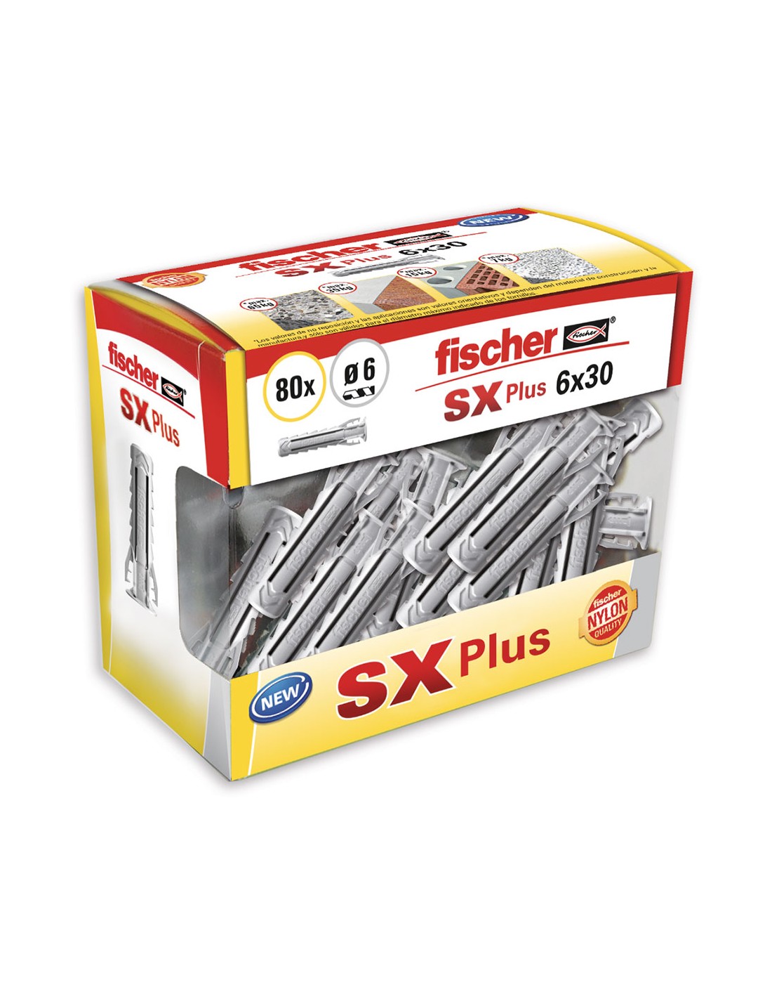 Taco sx plus ø6 x 30 mm, caja 80 uds. de fuerzas óptima gracias a la expansión de 4 vias. esto permite sujetar cargas más altas en materiales sólidos y huecos. fácil de montar: el borde del taco evita que éste se meta completamente en el agujero del taladro. no hay presión de expansión en el cuello del taco. esto significa que los azulejos o el yeso no se dañan. aplicaciones : jabonera, rodapiés etc. materiales:hormigón, ladrillo perforado vertical, bloques huecos hormigón ligero, losas de suelo hechas de ladrillos y hormigón, piedra natural con estructura densa, panel sólido fabricado en yeso, ladrillo sólido fabricado en hormigón liviano, etc
