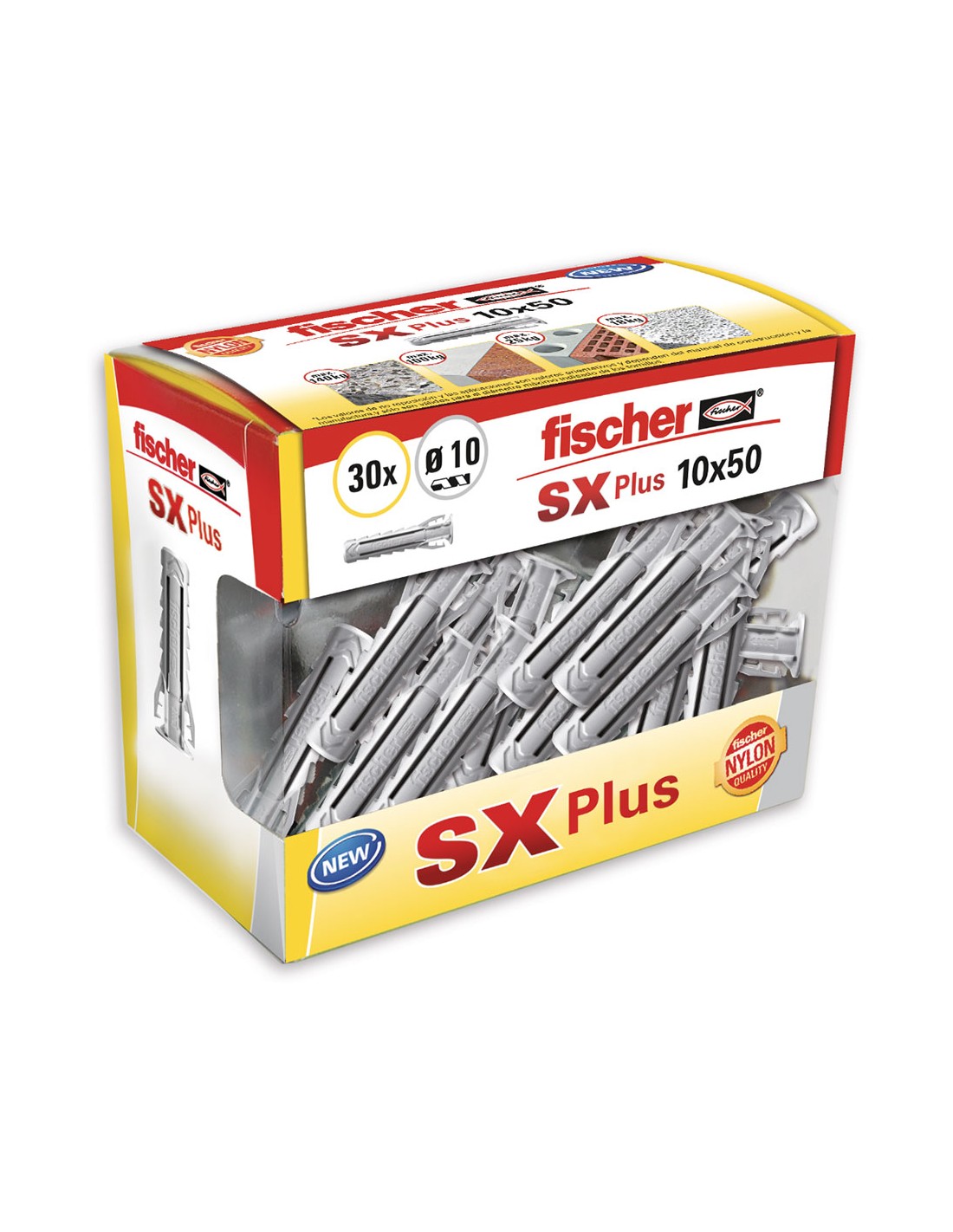 Taco sx plus ø10 x 50 mm, caja 30 uds. en formato caja bricolaje. poderosa fijación de nylon con cuatro vías de expansión, con reborde. transmisión de fuerzas óptima gracias a la expansión de 4 vias. esto permite sujetar cargas más altas en materiales sólidos y huecos. fácil de montar: el borde del taco evita que éste se meta completamente en el agujero del taladro. no hay presión de expansión en el cuello del taco. esto significa que los azulejos o el yeso no se dañan. aplicaciones : jabonera, rodapiés etc. materiales:hormigón, ladrillo perforado vertical, bloques huecos hormigón ligero, losas de suelo hechas de ladrillos y hormigón, piedra natural con estructura densa, panel sólido fabricado en yeso, ladrillo sólido fabricado en hormigón liviano, etc