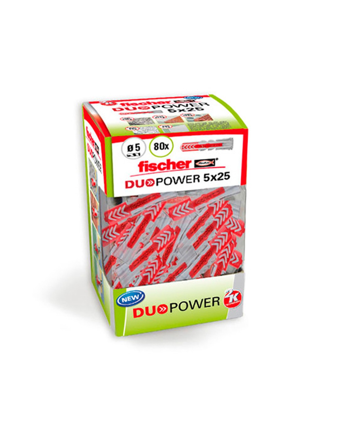 Taco duopower ø5 x 25 mm, caja 80 uds. en formato caja bricolaje. combinación de dos componentes de materiales para un mayor rendimiento.funciones seguras para materiales macizos (expansión) y perforados o placas (bloqueo/anudado). montaje sencillo: el borde estrecho del taco impide que se hunda en la perforación.mejor respuesta posible del taco: se nota que el taco encaja a la perfección. aplicaciones: muebles de televisión, iluminación, estantes, armario con espejo, cuadros, fijación de persianas, raíles de cortinas, fijaciones de lavabos, fijaciones de fontanería y calefacción, instalaciones de baños y servicios, armarios de pared, campanas extractoras etc. materiales: hormigón, ladrillo macizo, hormigón celular, placas y paneles de yeso, piedra natural, paneles aglomerado etc