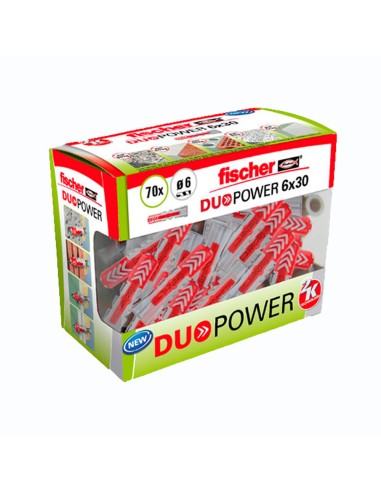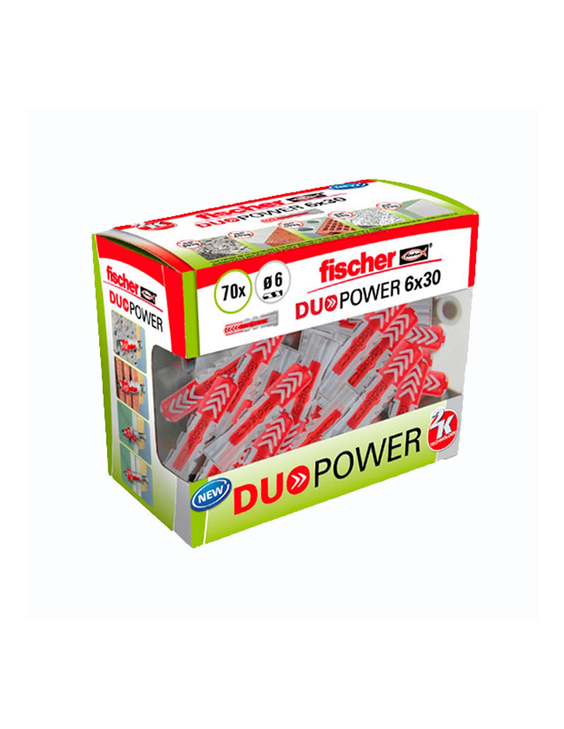 Taco duopower ø6 x 30 mm, caja 70 uds. en formato caja bricolaje. combinación de dos componentes de materiales para un mayor rendimiento.funciones seguras para materiales macizos (expansión) y perforados o placas (bloqueo/anudado). montaje sencillo: el borde estrecho del taco impide que se hunda en la perforación.mejor respuesta posible del taco: se nota que el taco encaja a la perfección. aplicaciones: muebles de televisión, iluminación, estantes, armario con espejo, cuadros, fijación de persianas, raíles de cortinas,fijaciones de lavabos, fijaciones de fontanería y calefacción, instalaciones de baños y servicios, armarios de pared, campanas extractoras etc. materiales: hormigón, ladrillo macizo, hormigón celular, placas y paneles de yeso, piedra natural, paneles aglomerado etc