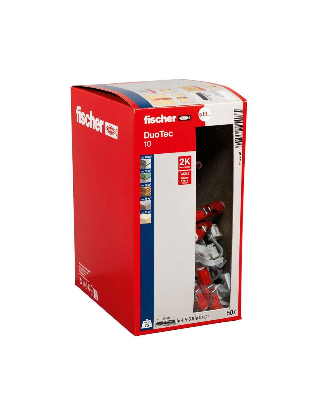 Taco duotec 10 50 unid. 537258 fischer. el duotec de fischer consta de dos componentes de plástico y funciona en materiales de construcción macizos de forma similar a un tapón de expansión. la palanca de gravedad de nylon es adecuada para cargas elevadas en todas las instalaciones de paredes secas. su elemento de palanca corto es ideal para su uso en cavidades estrechas y aisladas. ya sea para fijar el televisor en su sitio o para montar armarios de pared, lámparas y estanterías de pared, esta palanca de gravedad es un verdadero multitalento.
