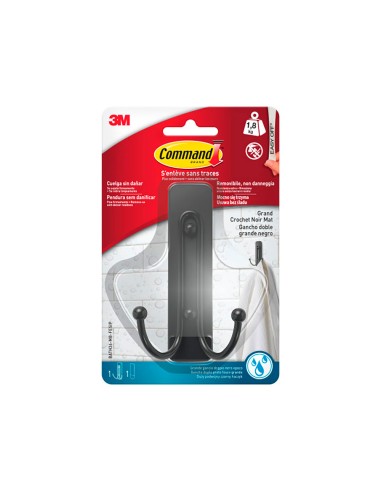 Gancho doble, grande, negro mate, 1 ud + 2 tiras, bath36, carga máxima 1,8 kg