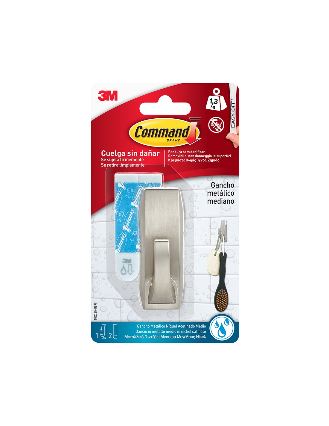 Gancho metálico con reflejos modernos, mediano, níquel satinado, 1 ud + 2 tiras, carga máxima 1,3 kg, mr02-sn-b