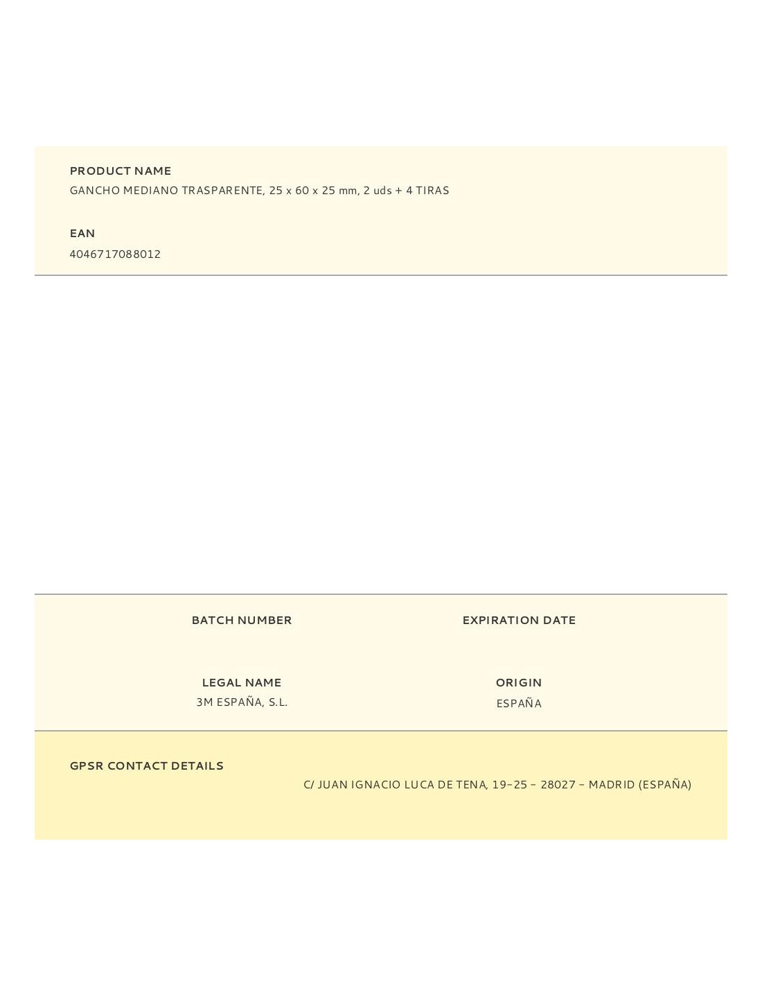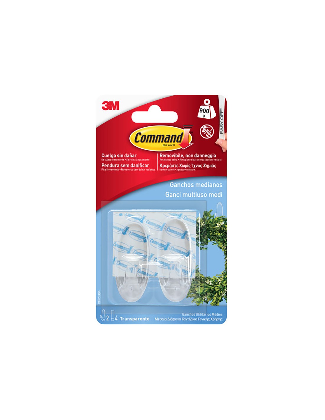 Gancho mediano trasparente 17091clr, contiene 2 uds + 4 tiras, con carga máxima 900 g. medidas: 25 x 60 x 25 mm