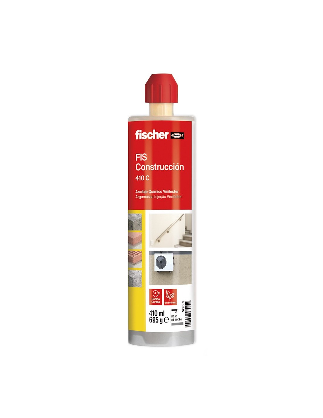 Anclaje químico a base de resina viniléster de alto rendimiento, solución diseñada para fijaciones eficientes en hormigón comprimido y mampostería. especialmente indicada para cargas medias. nueva fórmula química con mayor capacidad de carga y seguridad frente a resinas poliéster, alta resistencia al agua, sin saponificación, incluso en taladros húmedos, rápidos tiempos de curado en perforaciones secas y húmedas, producto sin estireno, solución óptima en relación calidad-precio para uso profesional, 410 ml