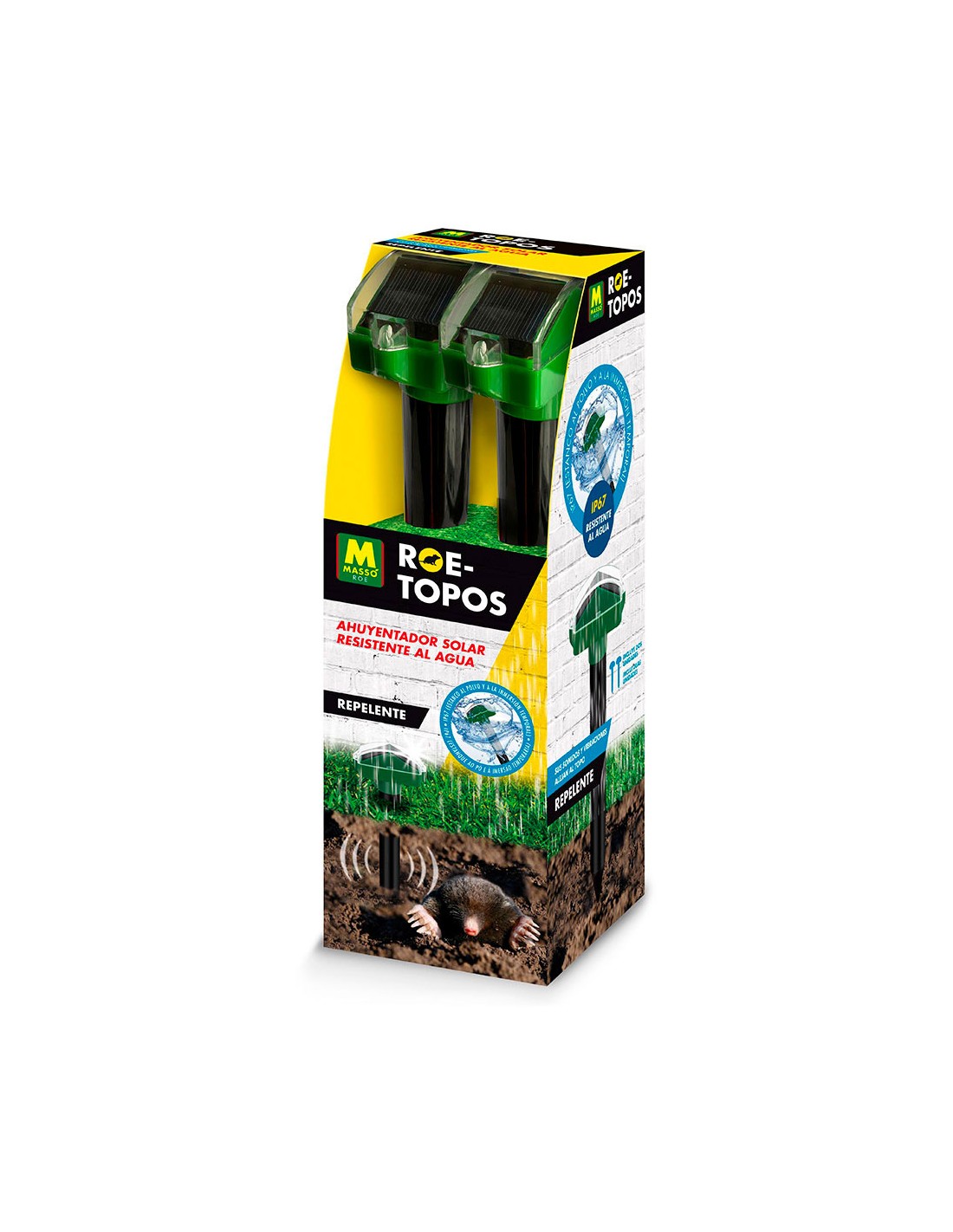 Repelente solar resistente al agua 2 unid. roe massó. el repelente solar para topos emite unas ondas sonoras y vibraciones a través de su tubo que imita el sonido de las señales de peligro para roedores y topos y los aleja de la zona. ip67. estanco al polvo y a la inmersión temporal del agua. resiste inmersión completa a 1m durante 30 min,cubre una extensión aproximada de 650 m 231644 masso