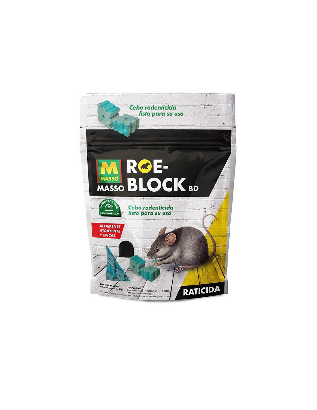 Roe-block 100g. cebo raticida en forma de bloque. elimina ratas, ratones y topillos y toda clase de roedores. tiene una buena combinación entre una gran apetencia y una máxima resistencia a la humedad. perforado longitudinalmente para ser colgado sin apoyarlo en el suelo. utilice los biocidas de forma segura. lea siempre la etiqueta y la informacion sobre el biocida antes de usarlo" 231533 massó"