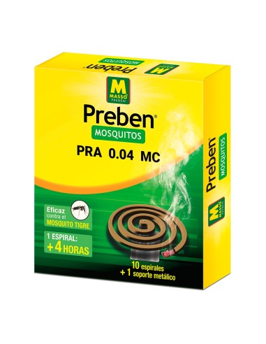 Espiral anti-mosquitos preben massó. protege eficazmente un área de 15m aproximadamente, contra todo tipo de mosquitos. la espiral actúa por la propagación de su principio activo, la praletrina. emite entre un 30 y 60% menos de monóxido de carbono y no contiene nitrato de potasio. preben 231453 masso