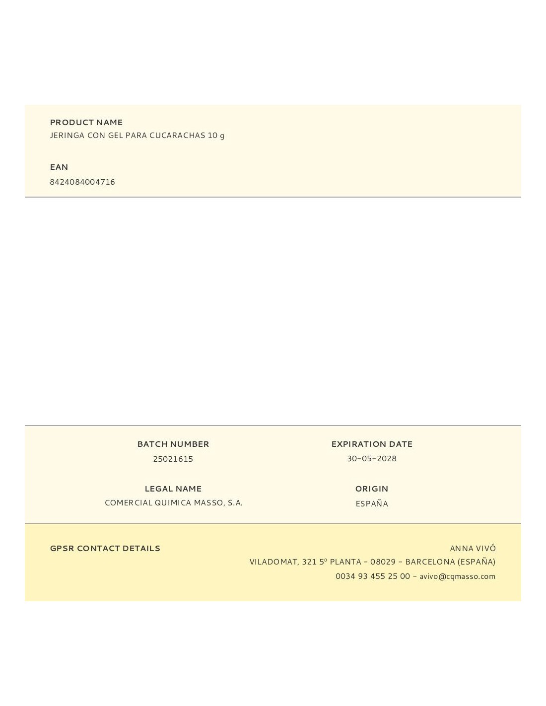 Jeringa con gel para cucarachas 10g. preben insecticida para el control de cucarachas. por su formulación permite ser utilizado como cebo y al morir en el nido infectadas por el imidacloprid 2,15%, puede provocar la mortalidad en larvas. preben 231449 massó