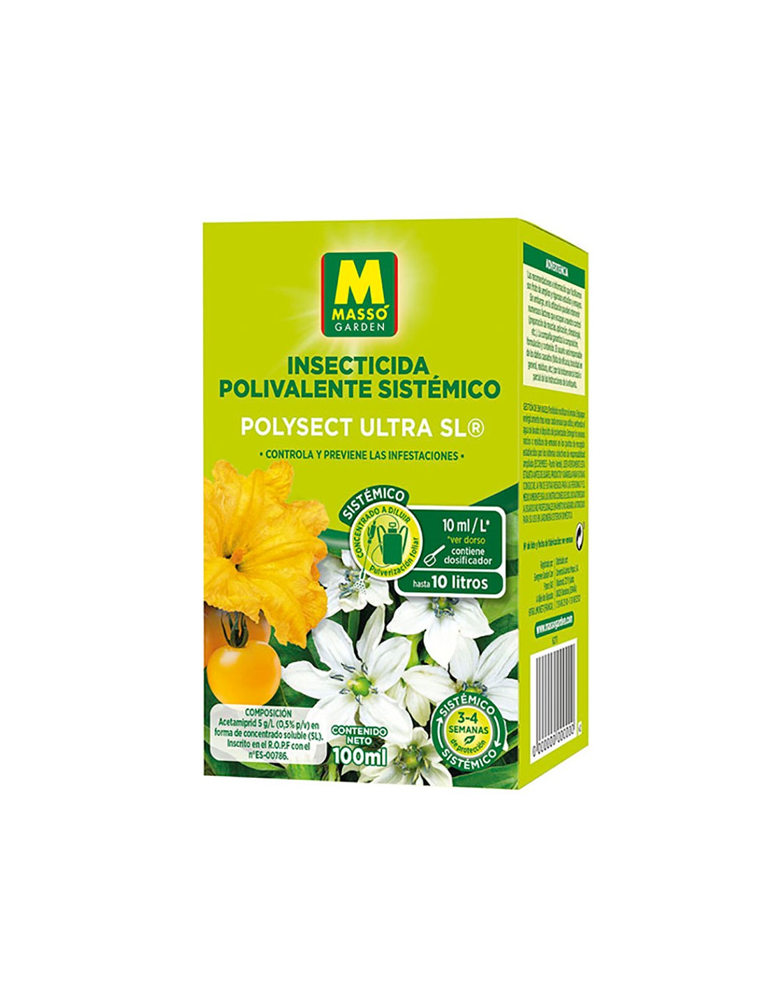 Insecticida polivalente masso 100ml. para el control de un amplio grupo de insectos. insecticida polivalente de amplio espectro a base de cipermetrina. se aplica en pulverizacion foliar para el control de pulgones, orugas, moscas blancas, trips, escarabajos, mosquitos, etc. para el control de insectos en hortícolas, ornamentales, herbáceas y arbustos ornamentales. dosis: 5ml para 1l de agua. 1% cipermetrina. 30267n massó