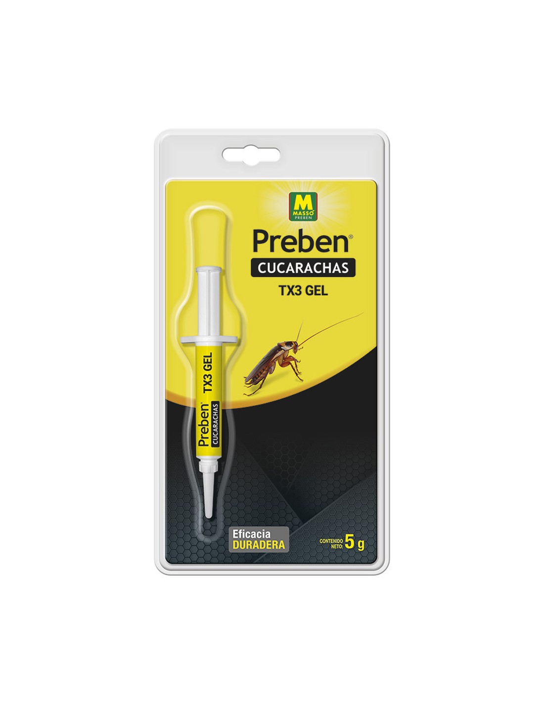 Jeringa con gel para cucarachas 5g. preben insecticida para el control de cucarachas. por su formulación permite ser utilizado como cebo y al morir en el nido infectadas por el imidacloprid 2,15%, puede provocar la mortalidad en larvas. preben 231639 massó