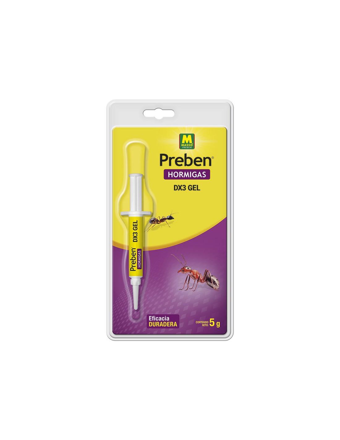 Gel jeringa dx3 antihormigas 5g. preben. elimina las principales especies de hormigas comunes y tropicales y sus nidos gracias al efecto dominó. cebo muy sabroso, nutritivo y azucarado que provoca una ingesta rápida con una mayor mortalidad. es incoloro,inodoro y no mancha. eficacia hasta 3 meses después de su aplicación. massó