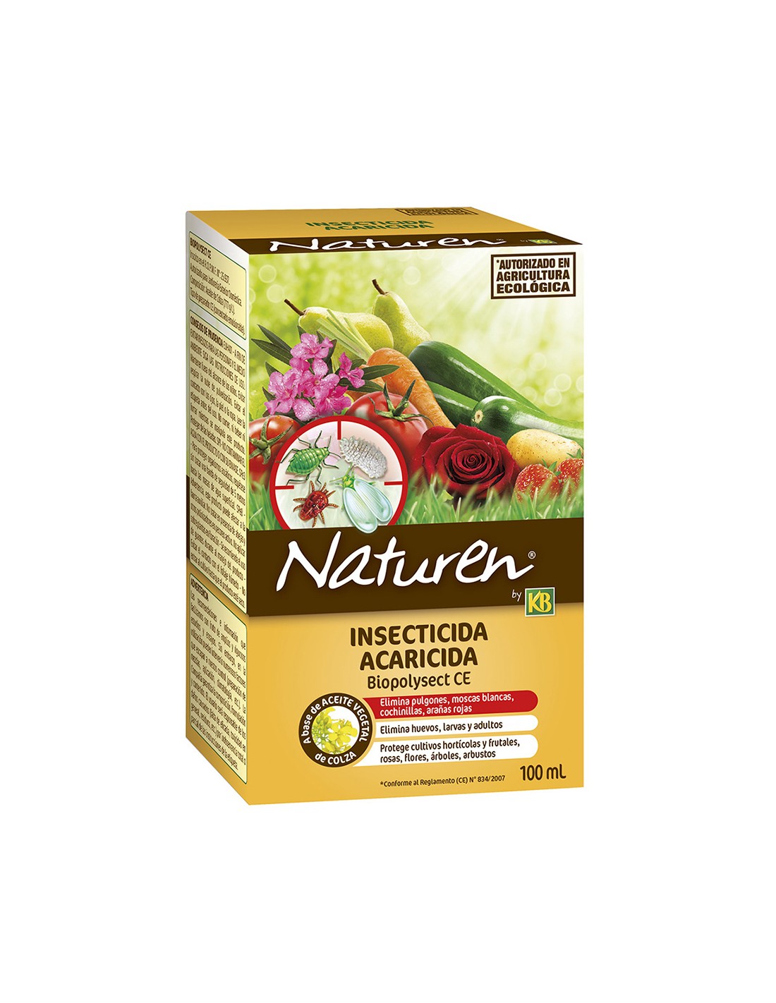 Kb naturen insecticida-acaricida 100ml. aceite concentrado que elimina gran variedad de insectos (pulgones, mosca blanca, cochinillas, ácaros…) en numerosos cultivos (ornamentales, hortícolas y frutales). plazo de seguridad: 2 días. utilizable en agricultura ecológica.