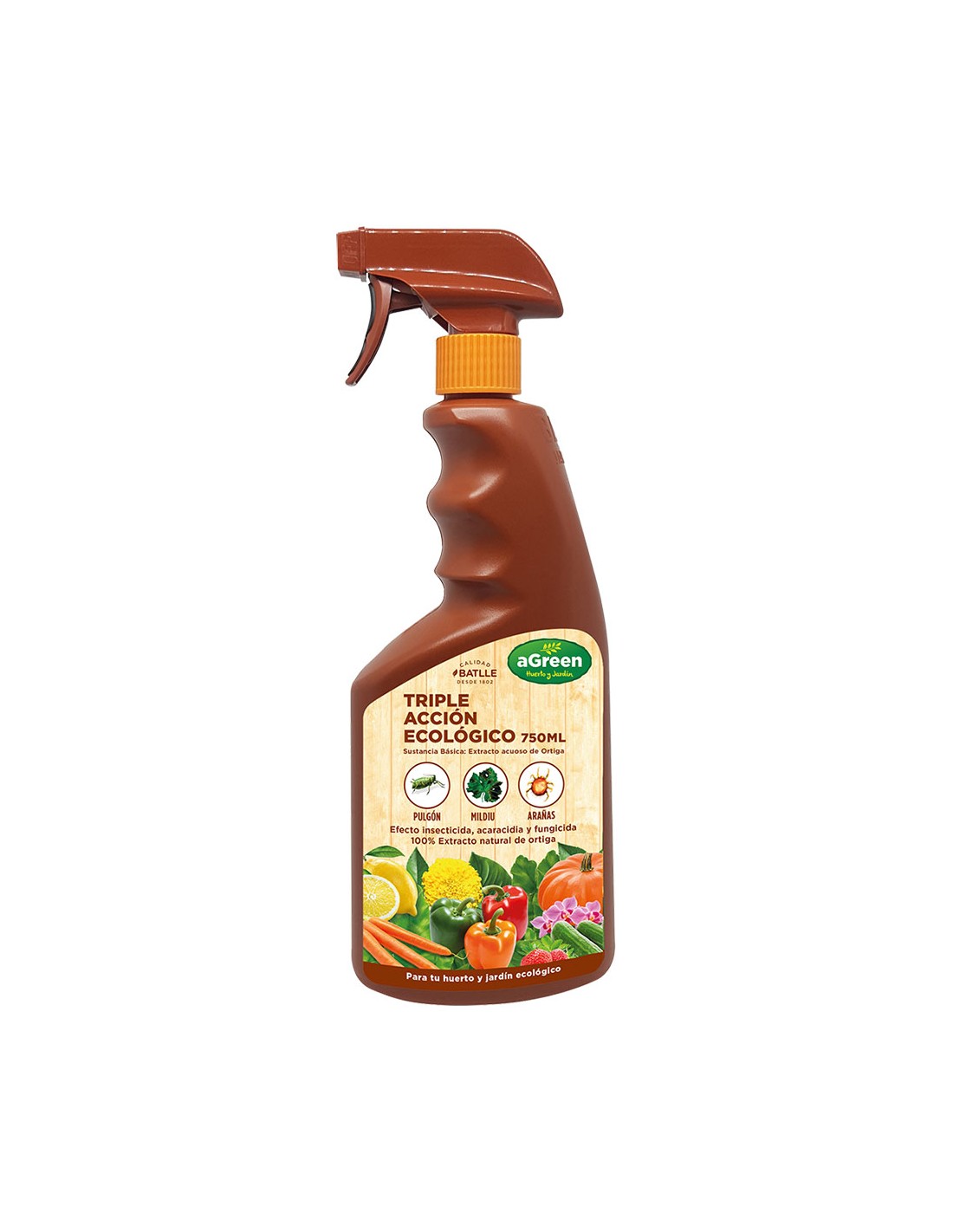 Triple accion eco pulverizador 750ml 730060unidh agreen. el triple acción ecológico agreen es un producto ecológico a base de extracto de ortiga y con función insecticida, acaricida y fungicida. actúa sobre las plagas y enfermedades con amplio rango de actividad y acción completa. este producto reduce las poblaciones de pulgones y ácaros sin afectar a la fauna auxiliar del jardín. por su composición, es rico en clorofila, flavonoides, taninos, carotenos y sales minerales.
