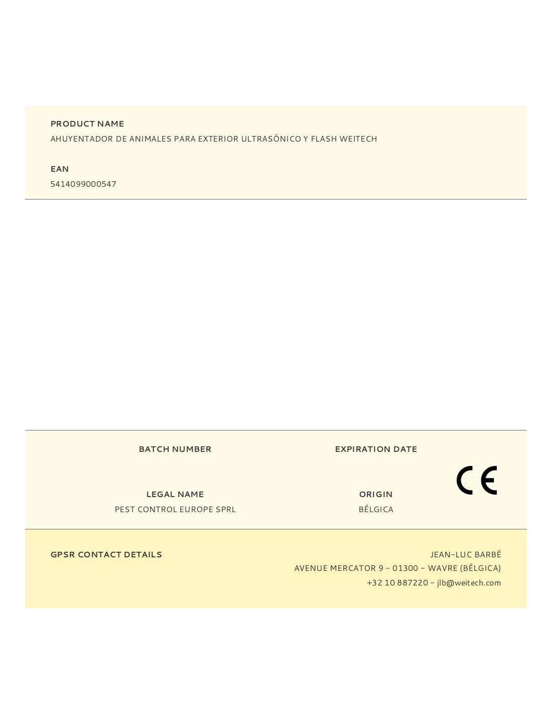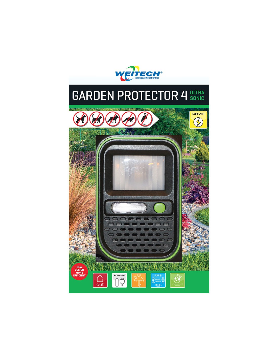 Ahuyentador de animales para exterior ultrasónico y flash weitech. ahuyenta perros, gatos, zorros, martas, conejos, garzas etc. area de protección:200m. funciona con 4 pilas v o adaptador 220v-50hz ref. 06129.