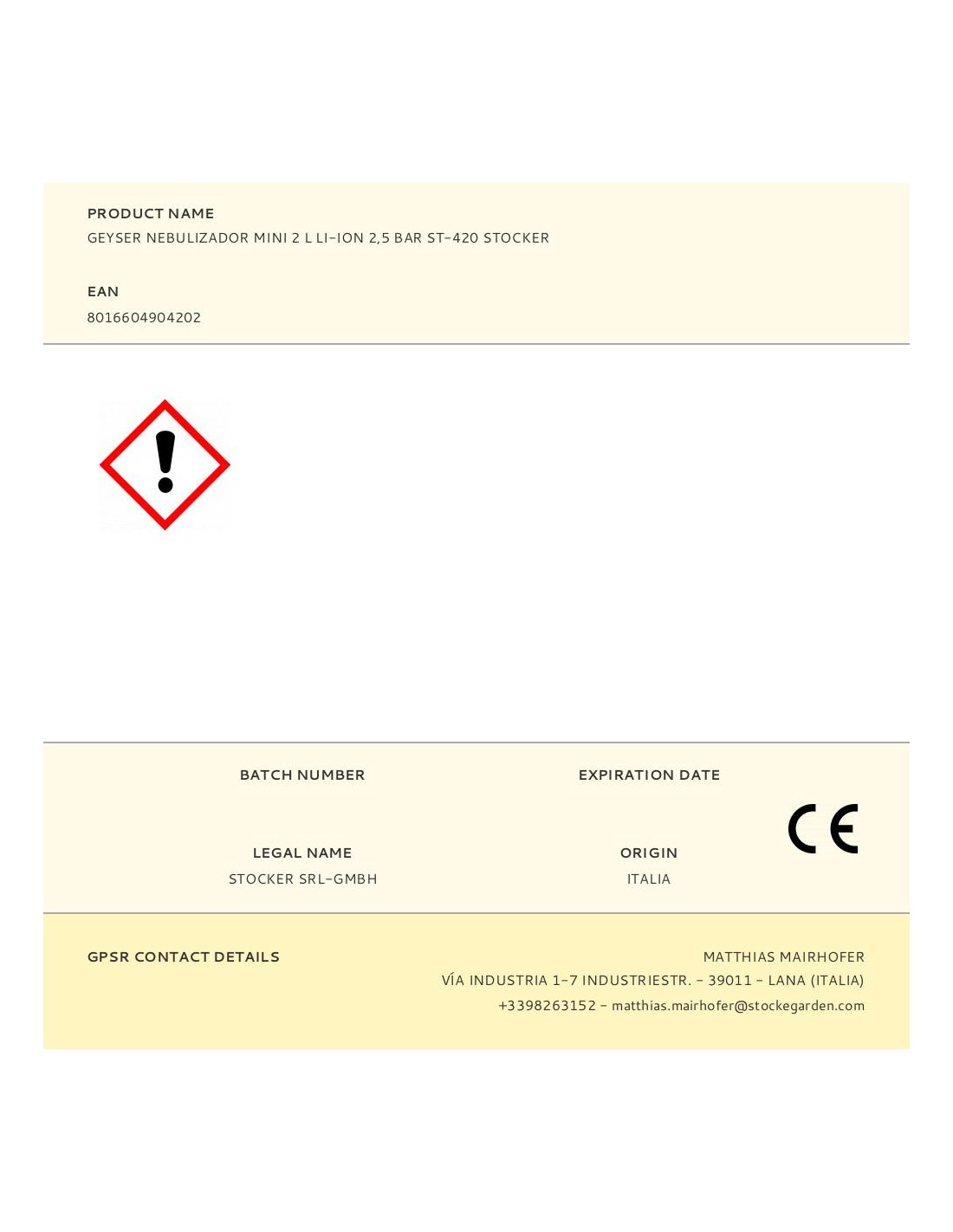 Geyser nebulizador mini 2 l li-ion 2,5 bar, ideal para tratamientos con liquidos contra mosquitos en zonas localizadas, como terraza, jardín, camping o balcón. diseño moderno, cómodo y ligero, 612g para un transporte comodo. funcionamiento rapido e intuitivo, maxima seguridad con el temporizador acustico de 30 segundos. configuración básica: ciclo de 120 segundos una sola vez. configuración de frecuencia: ciclo de 60 segundos repetido cada 15 minutos. equipado con 2 boquillas de nevulización ultrafinas. cable usb para carga incluido.