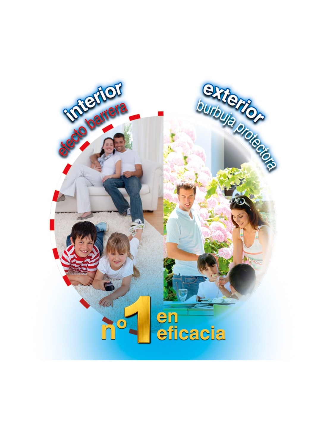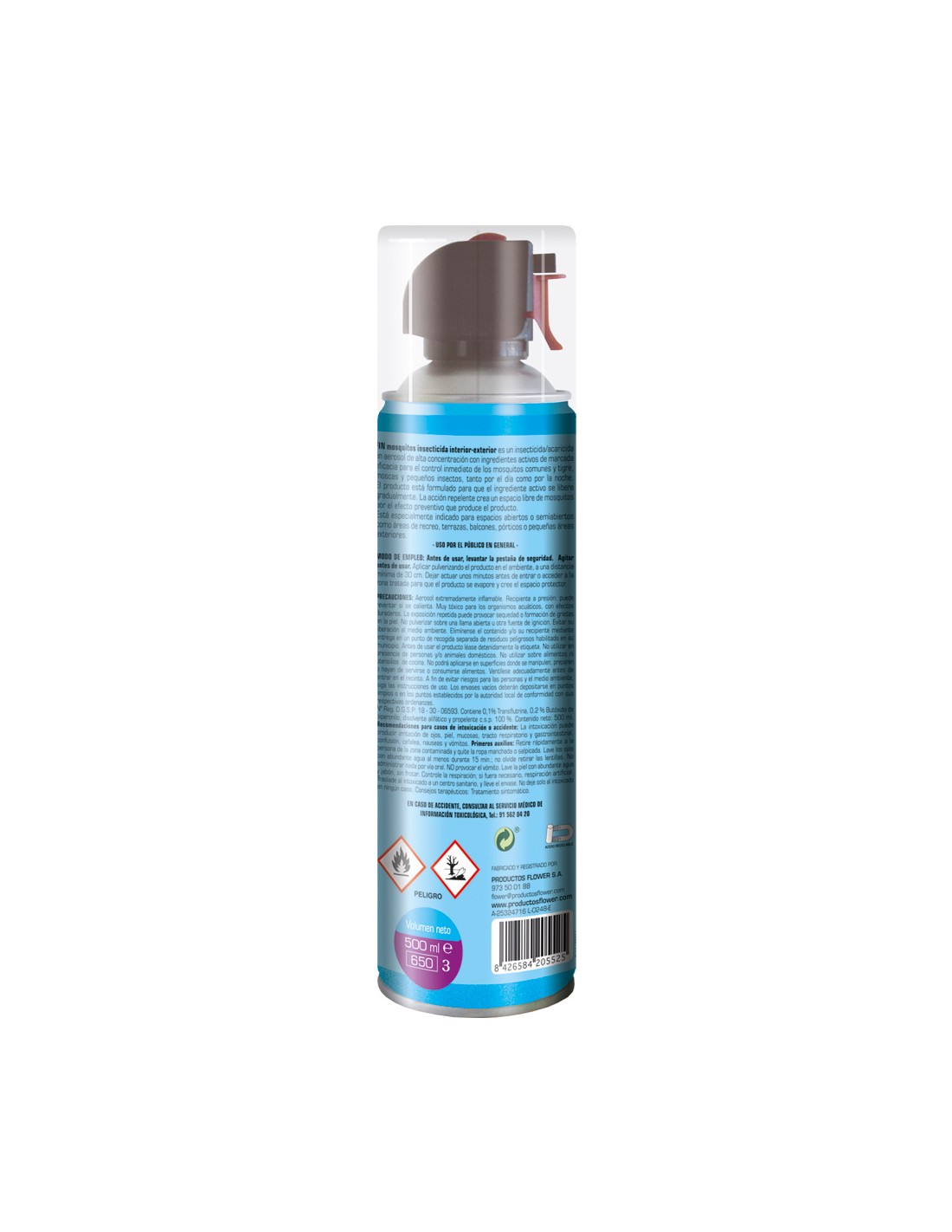 Insecticida en aerosol de alta concentración con ingredientes activos de marcada eficacia para el control inmediato de los mosquitos comunes, tigre, moscas y pequeños insectos. formulado para que se libere gradualmente, crea un espacio protector de hasta 8 horas de protección en exteriores e interiores. 500 ml
