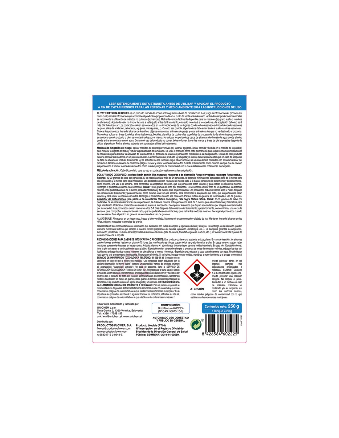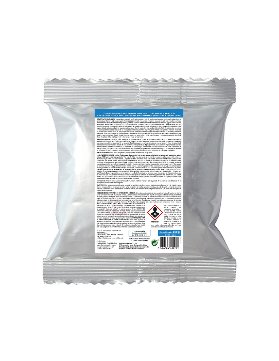 Rodonticida presentado en pequeños bloques muy atractivos y de fácil aplicación. se emplea para el control de todo tipo de roedores pero esta especialmente indicado en el control de topillos, rata de campo en jardines, hierba y huertos por su resistencia a las condiciones de exposición exterior. contenido: 2 x 250 g