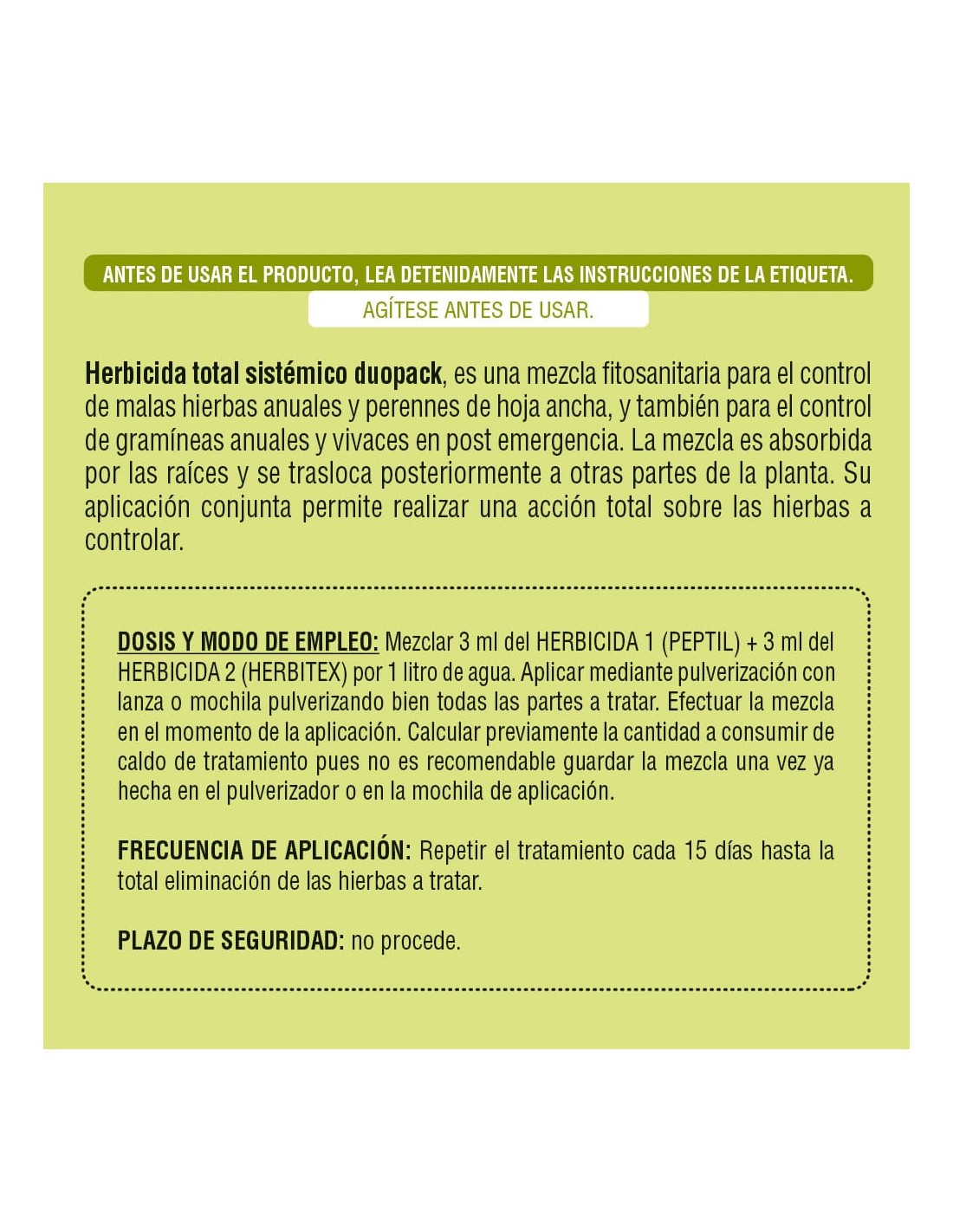 Una mezcla fitosanitaria para el control de malas hierbas anuales y perennes de hoja ancha, y también para el control de gramíneas anuales y vivaces en post emergencia. la mezcla es absorbida por las raíces y se trasloca posteriormente a otras partes de la planta. su aplicación conjunta permite realizar una acción total sobre las hierbas a controlar